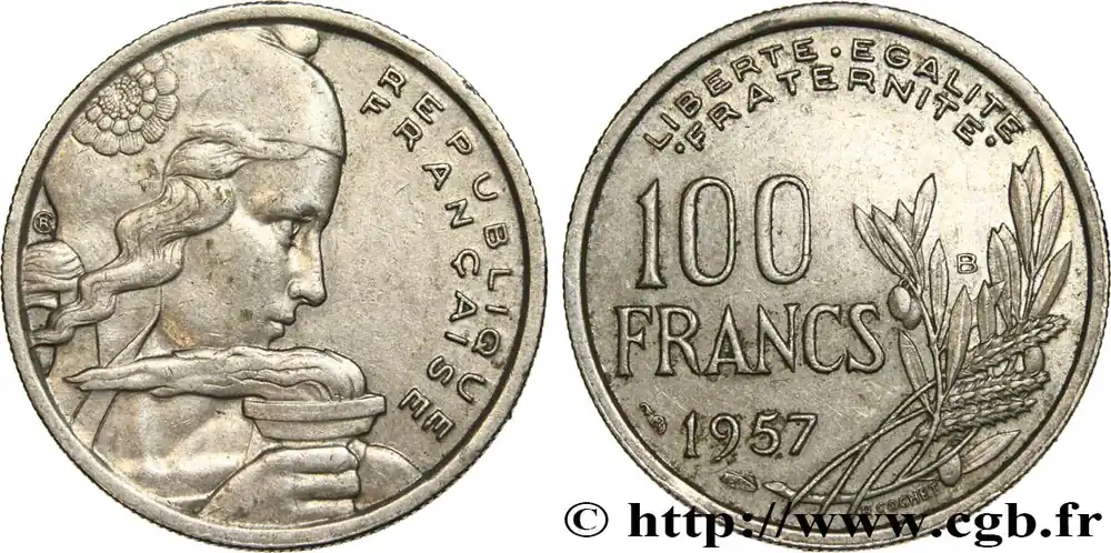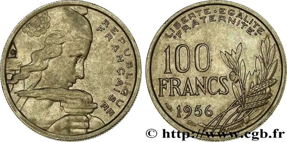 Type : 100 francs CochetDate : 1956Quantité frappée : 7.578.334Métal : cupro-nickelDiamètre : 24 mmAxe des coins : 6 h.Poids : 5,97 g.Tranche : canneléeCommentaires sur l’état de conservation :Un coup au revers dans les champs au milieu du bouquetRéférence ouvrage :Classement FRANC 2023 / FRANC 2023 classificationF.450/8AversTitulature avers : REPUBLIQUE / FRANÇAISE.Description avers : buste de Marianne aux cheveux longs à droite, coiffée du bonnet phrygien timbré d’une cocarde tricolore en pétales (centre guilloché en cercles concentriques, cercle de pétales lisses, cercle de pétales guillochées centrifuges), tenant un flambeau allumé dans le vent, signé RC en monogramme derrière la nuque.ReversTitulature revers : LIBERTE . EGALITE / .FRATERNITE. EN DEUX LIGNES, 100 FRANCS (MILLÉSIME) EN TROIS LIGNES, DIFFÉRENTS SOUS LE MILLÉSIME CONTRE LE LISTEL.Description revers : bouquet de trois épis et deux branches d’olivier chargées de fruits à droite, signé R. COCHET au-dessous contre le listel.HistoriqueQUATRIÈME RÉPUBLIQUE(16/01/1947-8/01/1959) Se caractérisant par un régime parlementaire doublé d’une grande instabilité ministérielle, la Quatrième République a pour particularité de n’avoir jamais été officiellement proclamée. En effet, De Gaulle, lors de son arrivée à Paris le 25 août 1944, refuse de le faire sous prétexte que la République n’avait jamais cessé d’exister. Considérant que l’État français du maréchal Pétain n’était qu’un simple état de fait, il estime que la République a survécu dans la France libre et son acte de naissance doit alors être le 18 juin 1940. Toutefois, son départ, le 20 janvier 1946, et le référendum du 13 octobre 1946 approuvant une nouvelle Constitution, marquent le début officiel de cette république. Elle connaît deux présidents : Vincent Auriol (16/01/1947 – 23/12/1953) et René Coty (23/12/1953 – 8/1/1959). La crise ouverte causée par la révolte de l’armée d’Algérie entraîne, en 1958, sa chute qui est confirmée par l’adoption d’une nouvelle constitution le 28 septembre 1958. Néanmoins, elle ne cesse définitivement d’être que le 8 janvier 1959 lors de l’installation du général de Gaulle comme président de la Ve République.