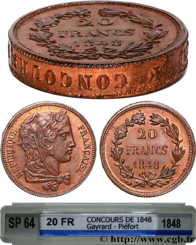 Type : 2 francs Louis-PhilippeDate : 1847Nom de l’atelier/ville : BordeauxQuantité frappée : 6498Métal : argentTitre en millième : 900 ‰Diamètre : 27 mmAxe des coins : 6 h.Poids : 10 g.Tranche : canneléeDegré de rareté : R2SlabNGC : MS63Commentaires sur l’état de conservation :Sous coque NGC MS63Référence ouvrage :Classement FRANC 2023 / FRANC 2023 classificationF.260/114AversTitulature avers : LOUIS PHILIPPE I ROI DES FRANÇAIS.Description avers : Tête à droite de Louis-Philippe Ier coiffé d’une couronne de chêne dont l’une des extrémités du ruban qui la noue derrière la tête revient sur le cou ; signé DOMARD. F. au-dessous du cou contre le listel.ReversTitulature revers : 2 / FRANCS.Description revers : en deux lignes, au-dessus de 1847, le tout dans une couronne nouée par un ruban à sa base, formée à gauche d’une branche de laurier, à droite d’une branche d’olivier ; au-dessous le différent du Graveur Général encadré à droite la lettre d’atelier K et à gauche du différent de Directeur.HistoriqueLOUIS-PHILIPPE Ier(7/08/1830-24/02/1848) Né à Paris en 1773, Louis-Philippe est le fils aîné de Louis-Philippe Joseph, duc d’Orléans (Philippe-Égalité), guillotiné en 1793 pour corruption après avoir voté la mort de son cousin Louis XVI. Il porte successivement les titres de duc de Valois, de Chartres puis d’Orléans à compter de 1793. Favorable à la Révolution, comme son père, il doit néanmoins se réfugier en Suisse puis il voyage en Scandinavie, aux États-Unis et enfin s’établit en Angleterre en 1801. La Restauration lui permet de retrouver les biens immenses de sa famille mais il reste considéré comme un rival potentiel par Louis XVIII qui le reçoit froidement. Réfugié en Angleterre lors des Cent-Jours, il revient en France en 1817. Âpre au gain, il donne son appui à l’opposition représentée par le parti libéral tout en s’appuyant sur la haute bourgeoisie possédante. Les journées de 1830 lui donnent l’occasion d’accéder au pouvoir après avoir adhéré au drapeau tricolore et multiplié les promesses. Il devient le 31 juillet 1830 lieutenant général du royaume puis roi des Français le 7 août. Son règne, sous une apparence libérale, va devenir celui de la bourgeoisie et des milieux d’affaires tandis que les oppositions (légitimistes, bonapartistes, républicaines et socialistes) sont maintenues dans l’illégalité. Sa politique de paix et son autorité lui valent alors un prestige important auprès des cours européennes. Le banquier Laffitte est Premier ministre. La Fayette est l’un des artisans de cette « révolution bourgeoise ». Le 13 mars 1831, Casimir Périer remplace Laffitte. La France intervient en Belgique en août 1831 pour contrer les Hollandais. Les Légitimistes, avec le complot de la rue des Prouvaires, tentent d’établir Henri V comme roi tandis que sa mère essaie de soulever la Vendée. Elle est arrêtée le 3 décembre 1832 à Nantes. L’épidémie de choléra tue plus de dix mille personnes à Paris, dont Casimir Périer. Les obsèques du général Lamarque sont l’occasion d’une tentative de soulèvement républicain, écrasé dans le sang (cf. Les Misérables). Les Français occupent Anvers le 23 décembre 1832. L’attentat de Fieschi du 28 juillet 1835 contre Louis-Philippe tue dix-huit personnes dont le maréchal Mortier. La première ligne de chemin de fer Paris-Orléans et la colonne de Juillet sont inaugurées respectivement les 24 octobre 1837 et 28 juillet 1840. L’année 1840 marque un tournant dans le régime, d’une grande instabilité ministérielle avant d’avoir le ministère Guizot (« Enrichissez-vous ! »). Le prince Louis-Napoléon Bonaparte, après une seconde tentative de putsch, est condamné à la réclusion perpétuelle et enfermé au fort de Ham dont il s’échappera en 1846. Les cendres de Napoléon sont ramenées de Sainte-Hélène et transférées aux Invalides. À partir de 1841, Louis-Philippe engage la France sur la voie de la conquête totale de l’Algérie, déjà commencée sous Charles X, tandis que se développe un important essor économique en Métropole. Une loi limite en 1841 le travail des enfants à 12 heures. Le premier accident grave de chemin de fer a lieu sur la ligne Paris-Versailles et fait 45 morts le 8 mai 1842. Le 13 juillet, le duc d’Orléans, fils aîné du roi, meurt accidentellement. Le 16 mai 1843, le duc d’Aumale prend la smala d’Abd-el-Kader qui parvient à s’enfuir. Bugeaud, gouverneur de l’Algérie, est fait Maréchal. 1843, c’est aussi le début de l’Entente Cordiale et la visite de la reine Victoria en France. Les Français battent les Marocains à Isly. Abd-el-Kader se rend le 23 décembre 1847. Le refus de réformes entraîne la chute du régime lors de la Campagne des Banquets et Louis-Philippe, détrôné le 24 février 1848, se réfugie en Angleterre après avoir abdiqué en faveur de son petit-fils.
