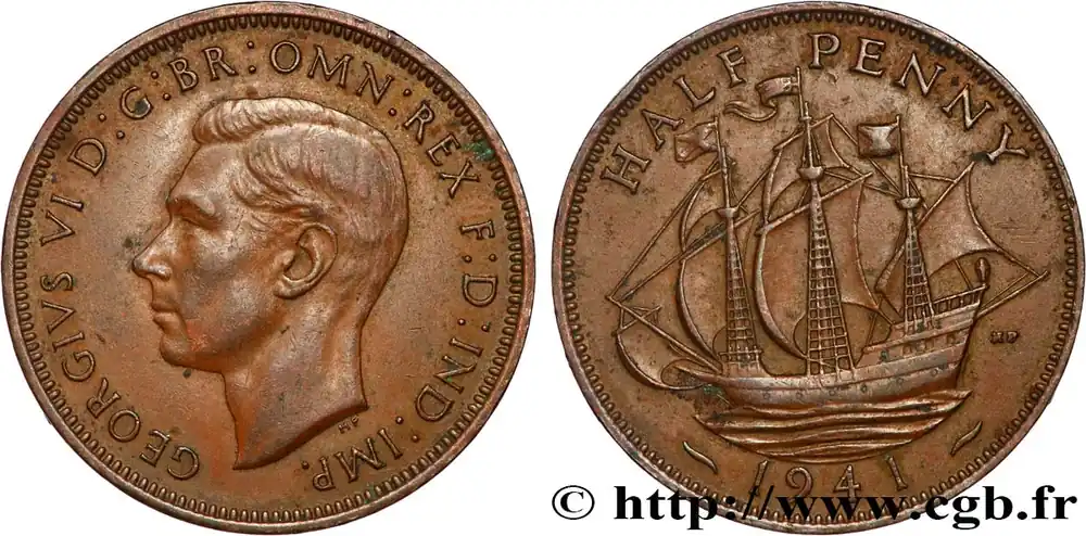 Type : 1/2 Penny Georges VIDate : 1944Quantité frappée : 81840000Métal : cuivreDiamètre : 25 mmAxe des coins : 12 h.Poids : 5,69 g.Tranche : lisseRéférence ouvrage :Sp.4115 – KM20/844 AversTitulature avers : GEORGIVS VI D:G:BR:OMN:REX F:D:IND:IMP:.Description avers : buste à gauche de Georges VI.Traduction avers : (Georges VI par la grâce de Dieu roi de toutes les Bretagnes, défenseur de la foi).ReversTitulature revers : HALF PENNY // 1944.Description revers : voilier Golden Hind de Sir Francis Drake.HistoriqueROYAUME-UNI