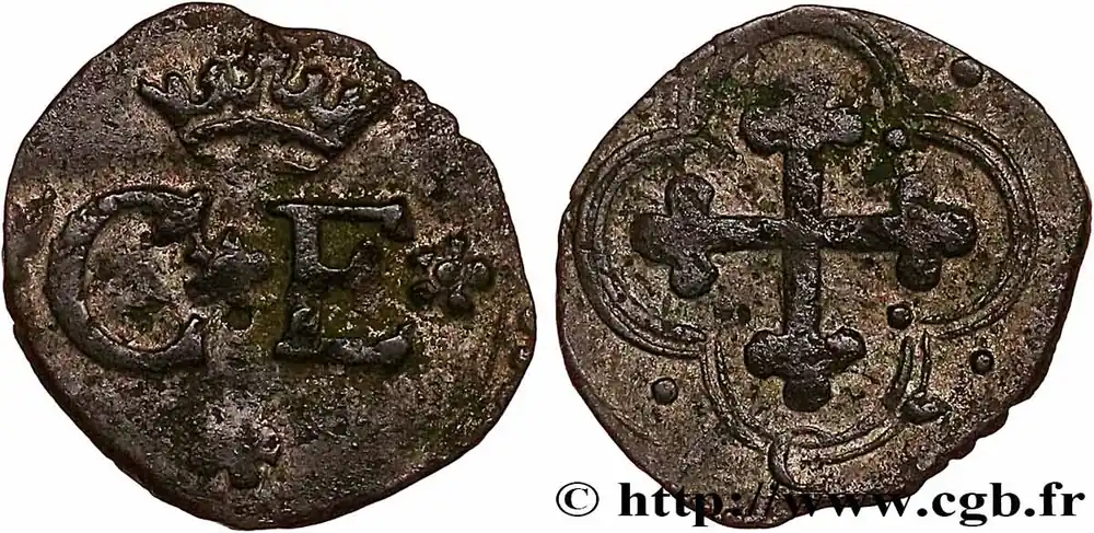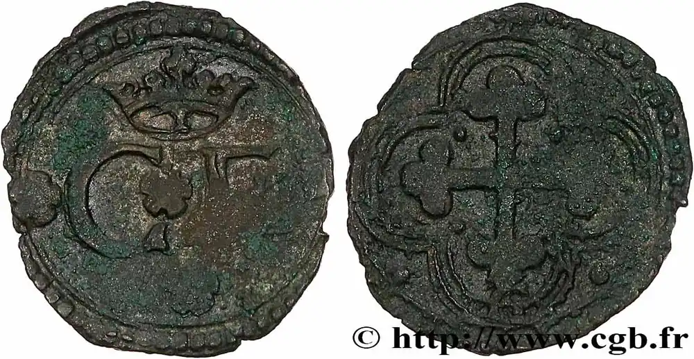 Type : Quart de sol (quarto di soldo)Date : n.d.Nom de l’atelier/ville : ChambéryMétal : billonDiamètre : 15 mmAxe des coins : 12 h.Poids : 0,91 g.Référence ouvrage :Bd.- – CNI/I.n° 533 p. 309 – Sim.I.83/3 p. 453 – Biaggin° 571 p. 809 – Cud.678d AversDescription avers : C*E couronné.Traduction avers : (Charles-Emmanuel).ReversDescription revers : Croix de saint Maurice cantonnée de quatre points, dans un double quadrilobe cantonné de quatre points ; au-dessous un C.CommentaireCe type monétaire fut frappé dans quatre ateliers : Aoste, Bourg-en-Bresse, Chambéry et Gex.HistoriqueSAVOIE – DUCHÉ DE SAVOIE – CHARLES-EMMANUEL Ier(30/08/1580-26/07/1630) Charles-Emmanuel Ier (1562-1630) est le fils d’Emmanuel-Philibert et de Marguerite de Valois, sœur d’Henri II qui est d’ailleurs mort au moment des fêtes données à l’occasion de leur mariage. Il succède à son père en 1580 et épouse Catherine de Habsbourg, fille de Philippe II d’Espagne en 1585. Après la mort d’Henri III, il soutient la Ligue et envahit la Provence en 1590. La guerre se termine par le traité de Vervins le 2 mai 1598 mais reprend en 1600 pour ne finir réellement qu’en 1601 par la paix de Lyon où le duc de Savoie se voit confirmer le marquisat de Saluzzo en échange de la Bresse, du Bugey et du pays de Gex qui sont annexés au royaume de France. À la mort de François de Gonzague, duc de Mantoue, Charles-Emmanuel revendique l’héritage du duché ; la guerre éclate contre l’Espagne en 1614 et se termine en 1617 par la paix de Madrid. La guerre reprend, avec la France cette fois, en 1628 après la mort de Ferdinand de Gonzague. Les Français envahirent la Savoie et le fort de Pignerol fut pris le 21 juillet 1630. Charles mourut cinq jours plus tard.