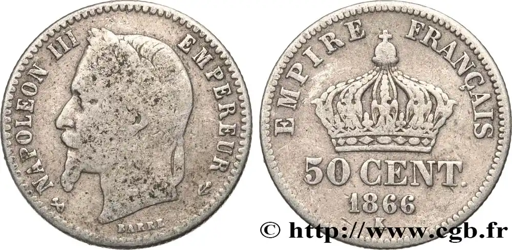 Type : 50 centimes Napoléon III, tête lauréeDate : 1866Nom de l’atelier/ville : BordeauxQuantité frappée : 3.500.433Métal : argentTitre en millième : 835 ‰Diamètre : 18 mmAxe des coins : 6 h.Poids : 2,46 g.Tranche : canneléeCommentaires sur l’état de conservation :Monnaie nettoyée Référence ouvrage :Classement FRANC 2023 / FRANC 2023 classificationF.188/11AversTitulature avers : (DIFFÉRENT) NAPOLEON III EMPEREUR (DIFFÉRENT).Description avers : Tête laurée de Napoléon III à gauche, un ruban descendant sur l’épaule ; au-dessous BARRE.ReversTitulature revers : EMPIRE FRANÇAIS.Description revers : 50 CENT. au-dessus du millésime et de la lettre d’atelier, sous une couronne impériale d’aigles supportant un globe crucigère.HistoriqueSECOND EMPIRE(02/12/1852-04/09/1870) Proclamé empereur sous le nom de Napoléon III, Louis Napoléon fait son entrée solennelle à Paris le 2 décembre 1852. Il épouse Eugénie Marie de Montijo, aristocrate espagnole, en janvier 1853. Son règne peut se diviser en trois périodes : l’Empire autoritaire jusqu’en 1860 ; l’Empire libéral de 1860 à 1870 puis l’Empire parlementaire en 1870. Durant l’Empire autoritaire, Napoléon III exerce son pouvoir sans partage, contrôle la presse tandis que les journaux pratiquent l’autocensure pour éviter leur suppression. Les préfets exercent une puissance illimitée dans les départements, les maires, les fonctionnaires sont nommés par le gouvernement. Comme sous le Premier Empire, l’Éducation et l’Université sont surveillées. Maintenant les grands principes de la révolution, la souveraineté du peuple est continuée grâce à la consultation par plébiscite. Sur le plan économique, l’essor est important, l’industrialisation se développe ainsi que les organismes de crédit et les grands magasins. Le prestige militaire est accru par la guerre de Crimée qui permet à la France de jouer un rôle international. L’attentat d’Orsini (janvier 1858) n’empêche nullement la France d’intervenir en Italie pour faire triompher le principe des nationalités et permet le rattachement de Nice et de la Savoie par le traité de Turin (mars 1860). Dès 1860, l’Empire évolue vers plus de libertés : traité libre-échangiste de commerce avec l’Angleterre, apparition d’une faible opposition dans le Corps législatif, octroi du droit de grève (1864), libéralisation de la presse (1868). Sur le plan international, la France acquiert la Nouvelle-Calédonie, la Cochinchine et encourage le creusement du canal de Suez par Ferdinand de Lesseps. Au Mexique, le soutien à Maximilien et à l’Autriche est toutefois un échec. Les élections de 1869 sont très mauvaises pour le régime et l’opposition obtient 45 % des voix. Le régime évolue alors vers un Empire parlementaire en appelant Émile Ollivier, chef du parti orléaniste et libéral, au pouvoir. Après Sadowa en 1866 où la Prusse écrase l’Autriche, l’affaire du trône d’Espagne et de la dépêche d’Ems entraînent la guerre qui est déclarée le 19 juillet 1870. Accumulant les revers, l’armée française est encerclée dans Metz puis Napoléon III, malade, capitule à Sedan le 2 septembre. Aussitôt la nouvelle connue, la déchéance de l’Empire est annoncée par Gambetta puis la République est proclamée le 4 septembre. Napoléon III est alors emmené en captivité en Hesse puis part dans le Kent où il meurt en 1873.