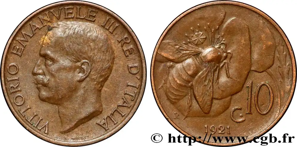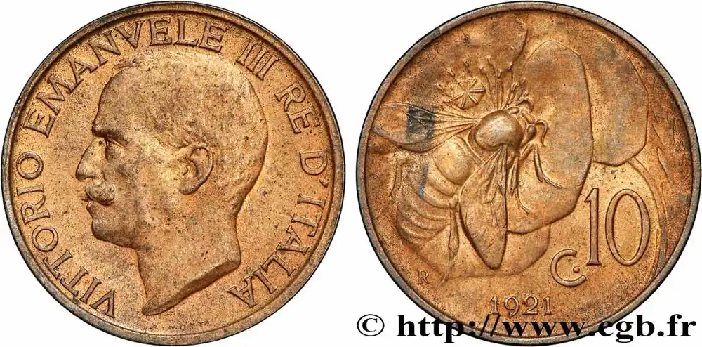 Type : 10 Centesimi Victor Emmanuel IIIDate : 1922Nom de l’atelier/ville : Rome – RQuantité frappée : 45217487Métal : cuivreDiamètre : 22,5 mmAxe des coins : 6 h.Poids : 5,51 g.Tranche : lisseRéférence ouvrage :Mont.331  – KM20/60 AversTitulature avers : VITTORIO EMANVELE III RE D’ITALIA // A. MOTTI.Description avers : portrait à gauche de Victor Emmanuel III.ReversTitulature revers : C.10 // R // 1922 R. BROZZI.Description revers : Abeille butinant une fleur.HistoriqueITALIE