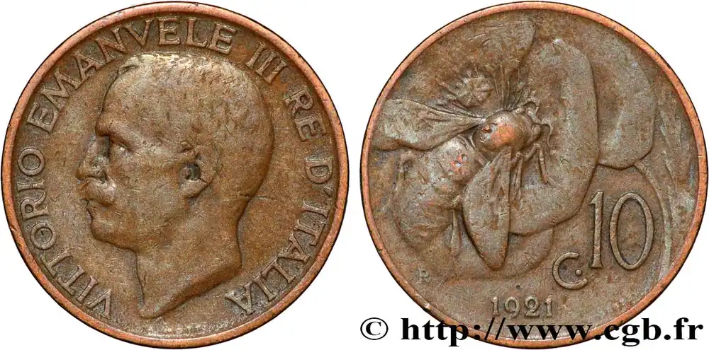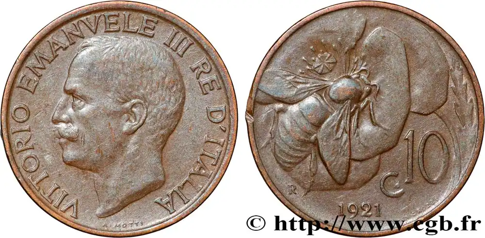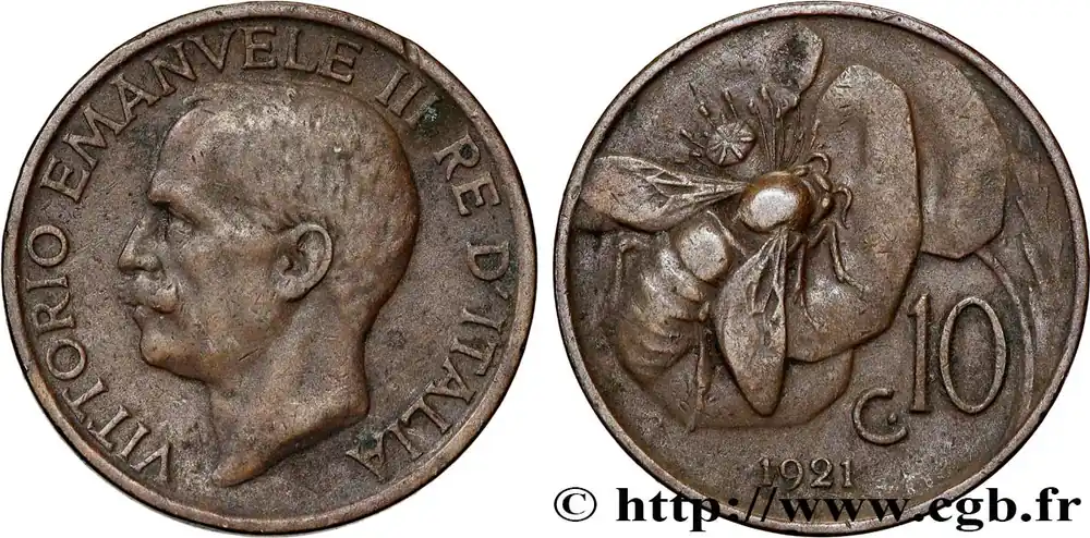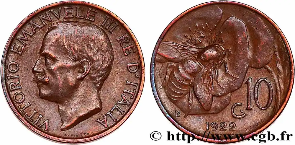 Type : 10 Centesimi Victor Emmanuel IIIDate : 1926Nom de l’atelier/ville : RomeQuantité frappée : 25190000Métal : cuivreDiamètre : 22,5 mmAxe des coins : 6 h.Tranche : lisseRéférence ouvrage :Mont.335 – KM20/60 AversTitulature avers : VITTORIO EMANVELE III RE D’ITALIA.Description avers : portrait à gauche.ReversTitulature revers : C.10 / 1926.Description revers : abeille butinant une fleur.HistoriqueITALIE