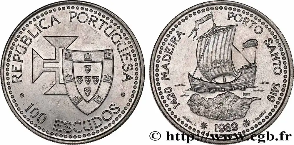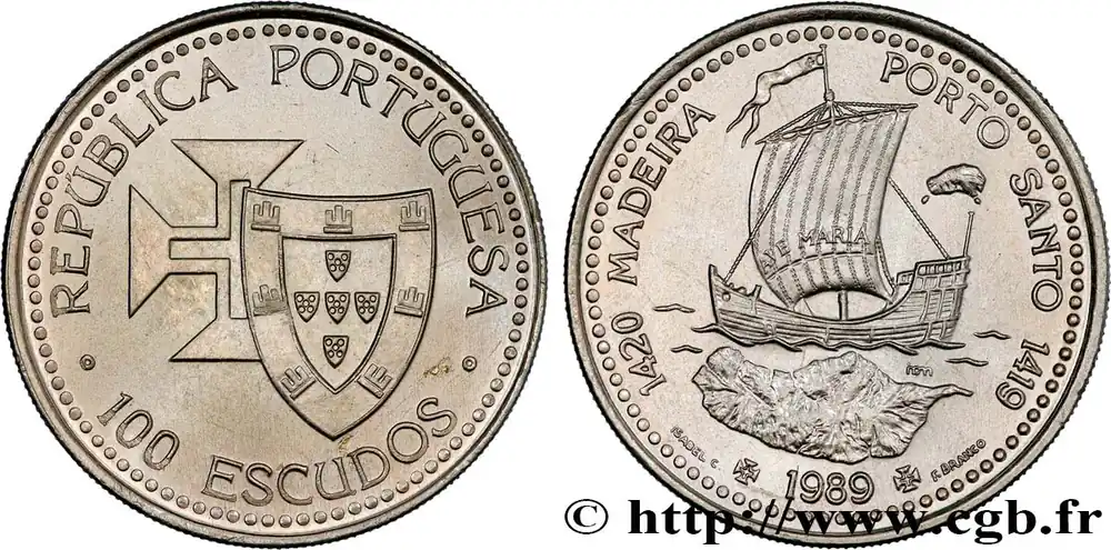Type : 100 Escudos Découvertes Portugaises de Madère 1420 et Porto Santo 1419Date : 1989Quantité frappée : 2000000Métal : cupro-nickelDiamètre : 34 mmAxe des coins : 6 h.Poids : 16,50 g.Tranche : striéeRéférence ouvrage :KM20/647  – Gom.80.01 AversTitulature avers : REPUBLICA PORTUGUESA // · 100 ESCUDOS ·.Description avers : écu du Portugal sur la croix de l’Ordre du Christ.ReversTitulature revers : 1420 MADEIRA – PORTO SANTO 1419 // AVE MARIA// INCM // ISABEL C ✠ 1989 ✠ F.BRANCO.Description revers : caravelle et carte de Madère.HistoriquePORTUGAL