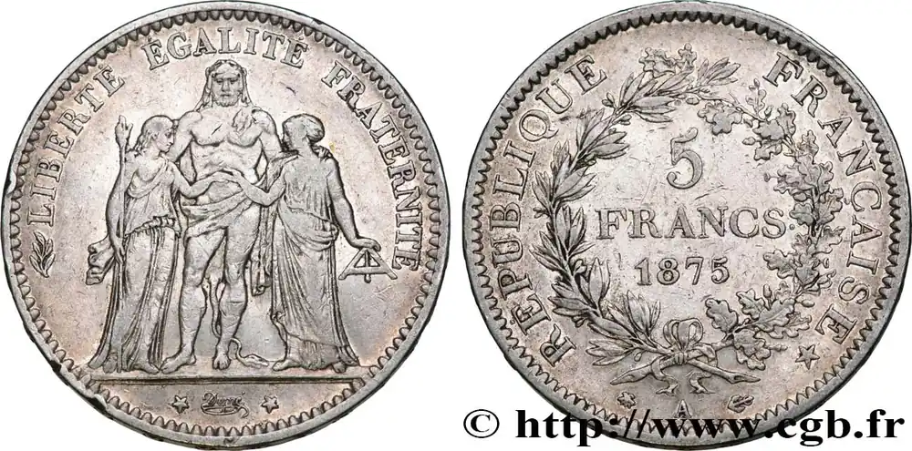 Type : 5 francs HerculeDate : 1873Nom de l’atelier/ville : ParisQuantité frappée : 27.192.181Métal : argentTitre en millième : 900 ‰Diamètre : 37 mmAxe des coins : 6 h.Poids : 25,02 g.Tranche : en relief : *****DIEU*PROTEGE*LA*FRANCERéférence ouvrage :Classement FRANC 2023 / FRANC 2023 classificationF.334/9AversTitulature avers : (RAMEAU) LIBERTÉ ÉGALITÉ FRATERNITÉ.Description avers : Hercule barbu demi-nu, debout de face avec la léonté, sur son épaule gauche une patte du lion, sur son bras et autour de sa taille la peau du lion de Némée, derrière ses jambes queue et pattes du lion, unissant la Liberté debout à gauche tournée à droite tenant une pique surmontée d’une main de Justice, vêtue d’un peplos et l’Égalité debout à droite tournée à gauche, tenant le niveau, vêtue d’un chiton : à l’exergue, Dupré en cursif entre deux étoiles.ReversTitulature revers : RÉPUBLIQUE FRANÇAISE*.Description revers : 5 / FRANCS, en deux lignes au-dessus de 1873, le tout contenu dans une couronne composée à gauche d’une branche de laurier, à droite d’une branche de chêne, nouées à leur base par un ruban ; au-dessous du nœud la lettre d’atelier A encadrée des différents.CommentaireTranche B.HistoriqueTROISIÈME RÉPUBLIQUE(4/09/1870-10/07/1940) La nouvelle de la capitulation de Sedan provoque la révolution du 4 septembre 1870 à Paris. Proclamée à l’Hôtel de Ville, la République est dotée d’un gouvernement provisoire appelé gouvernement de la Défense nationale. Menacé à gauche par l’insurrection de la Commune et à droite par les monarchistes, le nouveau régime connaît des débuts difficiles. Chef du pouvoir exécutif dans un premier temps (février 1871), Thiers est chargé de réorganiser le pays avant de choisir sa forme de gouvernement. Il devient président de la République en août 1871 et, malgré son action de libération du territoire, doit quitter son poste en mars 1873 face à l’opposition royaliste. Il est alors remplacé par Mac-Mahon favorable au rétablissement de la monarchie mais celle-ci n’est pas restaurée à la suite de la question du drapeau. La loi du septennat est alors mise en place en novembre 1873 puis, en 1875, sont votées les lois fondamentales qui servent de Constitution à la Troisième République. Régime parlementaire, elle se caractérise notamment par la nette prépondérance du pouvoir législatif sur le pouvoir exécutif. Anticléricale, la Troisième République rend l’école gratuite, laïque et obligatoire mais continue la politique coloniale pour ses ambitions économiques, stratégiques et morales. La séparation des Églises et de l’État est votée en 1905. L’idée d’une revanche sur l’Allemagne et un nationalisme important sont au cœur de la crise boulangiste, du scandale de Panama ou de l’affaire Dreyfus des années 1886-1899 tandis que la politique étrangère est très active notamment au Maroc et que la course aux armements se développe. La Première Guerre mondiale coûte cher à la France qui ne se relève qu’à partir de 1920 voire 1928 pour la monnaie avec le franc « Poincaré ». La crise de 1929 ne se fait sentir qu’à partir de 1932 mais dure jusqu’en 1939, période durant laquelle l’instabilité ministérielle est très importante. Vacillant en 1934, la Troisième République trouve un nouveau ciment unitaire avec l’antifascisme qui permet l’arrivée au pouvoir du Front populaire en 1936. Mais, paralysée face à l’Allemagne, la France va alors s’enliser dans une « drôle de guerre » puis connaître l’une des plus grandes défaites de son histoire en juin 1940. Réunies en Assemblée nationale à Vichy le 10 juillet 1940, les Chambres, pourtant élues en 1936, votent les pleins pouvoirs à Pétain dans une sorte de suicide collectif par 569 voix pour, 80 voix contre et 18 abstentions.