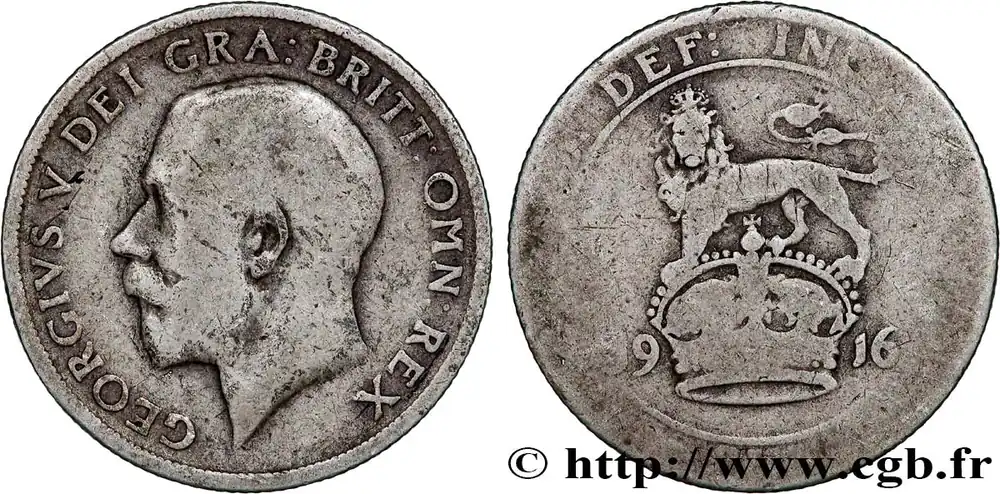 Type : 1 Shilling Georges VDate : 1921Nom de l’atelier/ville : LondresQuantité frappée : 22649000Métal : argentTitre en millième : 500 ‰Diamètre : 18,5 mmAxe des coins : 12 h.Poids : 5,55 g.Tranche : canneléeRéférence ouvrage :Sp.4023  – KM20/816a AversTitulature avers : GEORGIVS V DEI GRA: BRITT: OMN: REX.Description avers : Tête nue à gauche de Georges V.ReversTitulature revers : FID: DEF: IND. IMP. // 19 – 21 // ONE SHILLING.Description revers : Lion couronné à gauche sur une couronne.HistoriqueROYAUME-UNI