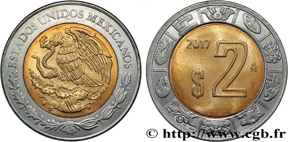 Type : 2 PesosDate : 1915Quantité frappée : -Métal : cuivreDiamètre : 22,5 mmAxe des coins : 6 h.Poids : 4,24 g.Tranche : striéeDegré de rareté : R2Référence ouvrage :KM20/745a – GB.353a AversTitulature avers : ESTADO L. Y. S. DE OAXACA* 1915*.Description avers : Buste à gauche de Benito Juarez.ReversTitulature revers : MONEDA PROVISIONAL / 2 / PESOS AG. 0.902 AU 0.010..Description revers : sur deux palmes.HistoriqueMEXIQUE – GOUVERNEMENT PROVISOIRE D’OAXACA(1915)