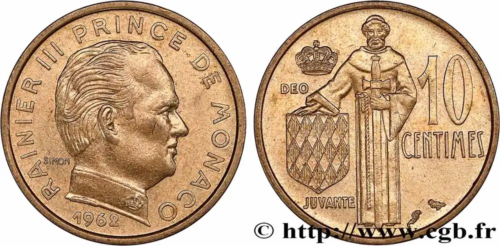 Type : 10 Centimes Rainier IIIDate : 1979Nom de l’atelier/ville : ParisQuantité frappée : 309000Métal : bronze-aluminiumDiamètre : 20 mmAxe des coins : 6 h.Poids : 3,01 g.Tranche : lisseDegré de rareté : R1Commentaires sur l’état de conservation :Monnaie nettoyéeRéférence ouvrage :G.2019.146 – KM20/142 AversTitulature avers : RAINIER III PRINCE DE MONACO/ 1979.Description avers : Buste nu de Rainier III à droite ; au-dessous, signé SIMON.ReversTitulature revers : DEO/ JUVANTE/ 10 CENTIMES.Description revers : Écu aux armes des Grimaldi soutenu par un moine soldat ; au-dessus une couronne.HistoriqueMONACO