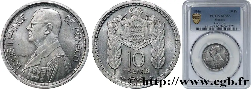 Type : 10 Francs Louis IIDate : 1946Nom de l’atelier/ville : ParisQuantité frappée : 1000000Métal : cupro-nickelDiamètre : 26 mmAxe des coins : 6 h.Poids : 7,058 g.Tranche : striéeRéférence ouvrage :G.2019.136 – KM20/123 AversTitulature avers : LOUIS II PRINCE – DE MONACO.Description avers : Buste à gauche en grand uniforme.ReversTitulature revers : 10 / FRANCS / 1946.Description revers : Armoiries de Monaco entourée de deux branches de laurier.HistoriqueMONACO