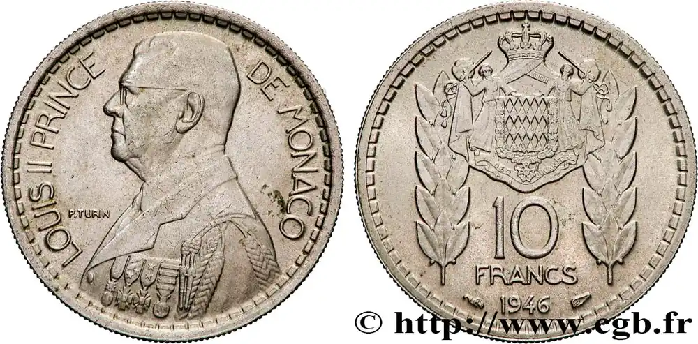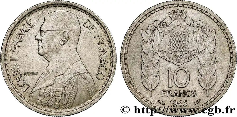 Type : 10 Francs Louis IIDate : 1946Nom de l’atelier/ville : ParisQuantité frappée : 1000000Métal : cupro-nickelDiamètre : 26 mmAxe des coins : 6 h.Poids : 6,87 g.Tranche : striéeRéférence ouvrage :G.2019.136 – KM20/123 AversTitulature avers : LOUIS II PRINCE – DE MONACO.Description avers : Buste à gauche en grand uniforme.ReversTitulature revers : 10 / FRANCS / 1946.Description revers : Armoiries de Monaco entourée de deux branches de laurier.HistoriqueMONACO