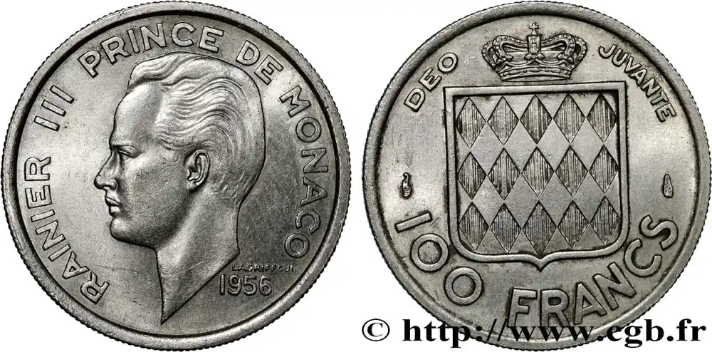 Type : 100 Francs Rainier IIIDate : 1950Nom de l’atelier/ville : ParisQuantité frappée : 500000Métal : cupro-nickelDiamètre : 30 mmAxe des coins : 6 h.Poids : 12,00 g.Tranche : lisseRéférence ouvrage :G.2019.142  – KM20/115 AversTitulature avers : RAINIER III PRINCE DE MONACO // 1950.Description avers : Portrait du prince à gauche, dans un grènetis, la pointe du buste coupant celui-ci.ReversTitulature revers : DEO JUVANTE / 100 FRANCS.Description revers : Cavalier levant une épée, portant les armes des Grimaldi, sur un cheval caparaçonné, à l’attaque à droite, dans un grènetis intérieur limité aux légendes.HistoriqueMONACO