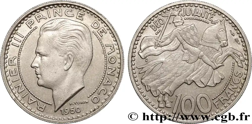 Type : 100 Francs Rainier IIIDate : 1950Nom de l’atelier/ville : ParisQuantité frappée : 500000Métal : cupro-nickelDiamètre : 30 mmAxe des coins : 6 h.Poids : 12,09 g.Tranche : lisseRéférence ouvrage :G.2019.142  – KM20/115 AversTitulature avers : RAINIER III PRINCE DE MONACO // 1950.Description avers : Portrait du prince à gauche, dans un grènetis, la pointe du buste coupant celui-ci.ReversTitulature revers : DEO JUVANTE / 100 FRANCS.Description revers : Cavalier levant une épée, portant les armes des Grimaldi, sur un cheval caparaçonné, à l’attaque à droite, dans un grènetis intérieur limité aux légendes.HistoriqueMONACO