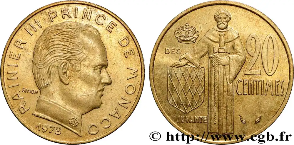 Type : 20 Centimes Rainier IIIDate : 1962Nom de l’atelier/ville : ParisQuantité frappée : 750000Métal : bronze-aluminiumDiamètre : 23,5 mmAxe des coins : 6 h.Poids : 4 g.Tranche : striéeRéférence ouvrage :G.2019.147  – KM20/143 AversTitulature avers : RAINIER III PRINCE DE MONACO/ (DATE).Description avers : Buste nu de Rainier III à droite ; au-dessous, signé SIMON.ReversTitulature revers : DEO/ JUVANTE/ 20 CENTIMES.Description revers : Écu aux armes des Grimaldi soutenu par un moine soldat ; au-dessus une couronne.HistoriqueMONACO