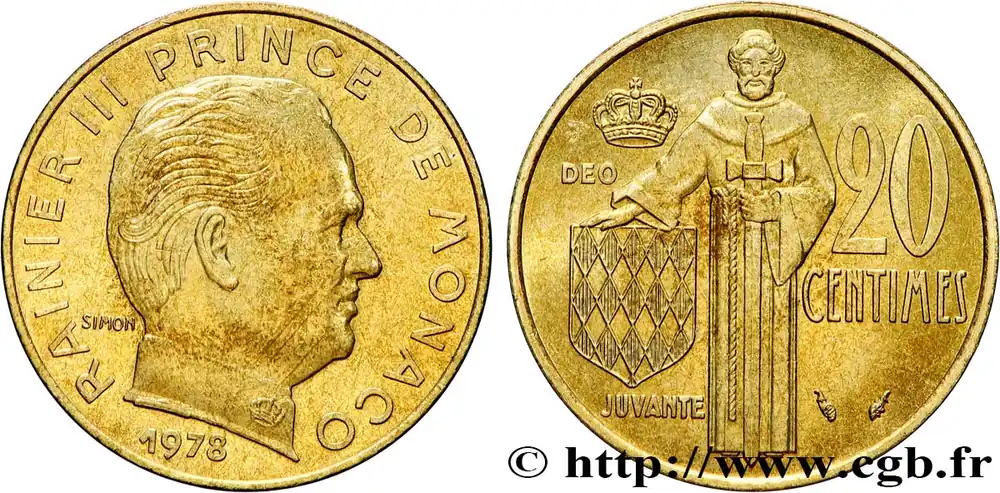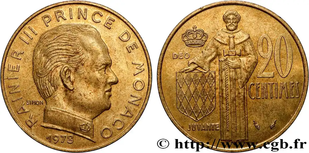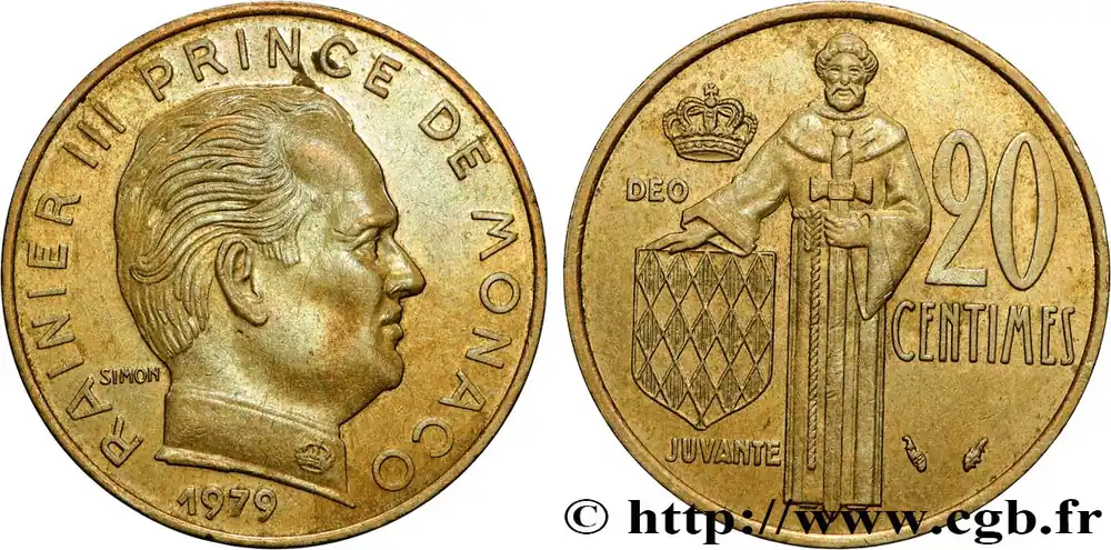 Type : 20 Centimes Rainier IIIDate : 1974Nom de l’atelier/ville : ParisQuantité frappée : 97500Métal : bronze-aluminiumDiamètre : 23,5 mmAxe des coins : 6 h.Poids : 3,97 g.Tranche : striéeRéférence ouvrage :G.2019.147 – KM20/143 AversTitulature avers : RAINIER III PRINCE DE MONACO/ (DATE).Description avers : Buste nu de Rainier III à droite ; au-dessous, signé SIMON.ReversTitulature revers : DEO/ JUVANTE/ 20 CENTIMES.Description revers : Écu aux armes des Grimaldi soutenu par un moine soldat ; au-dessus une couronne.HistoriqueMONACO