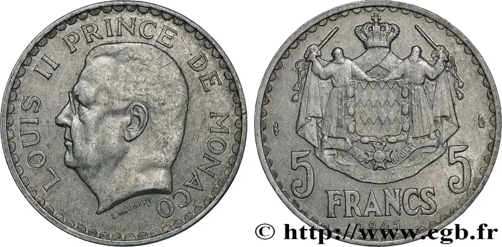 Type : 5 Francs Louis IIDate : 1945Nom de l’atelier/ville : ParisQuantité frappée : 1000000Métal : aluminiumDiamètre : 31 mmAxe des coins : 6 h.Poids : 3,87 g.Tranche : lisseRéférence ouvrage :G.2019.135 – KM20/122 AversTitulature avers : LOUIS II PRINCE DE MONACO.Description avers : Tête à gauche.ReversTitulature revers : 5 FRANCS / 1945.Description revers : Armoiries de Monaco.HistoriqueMONACO