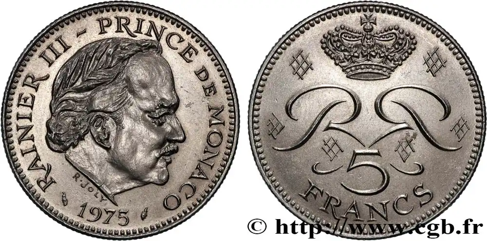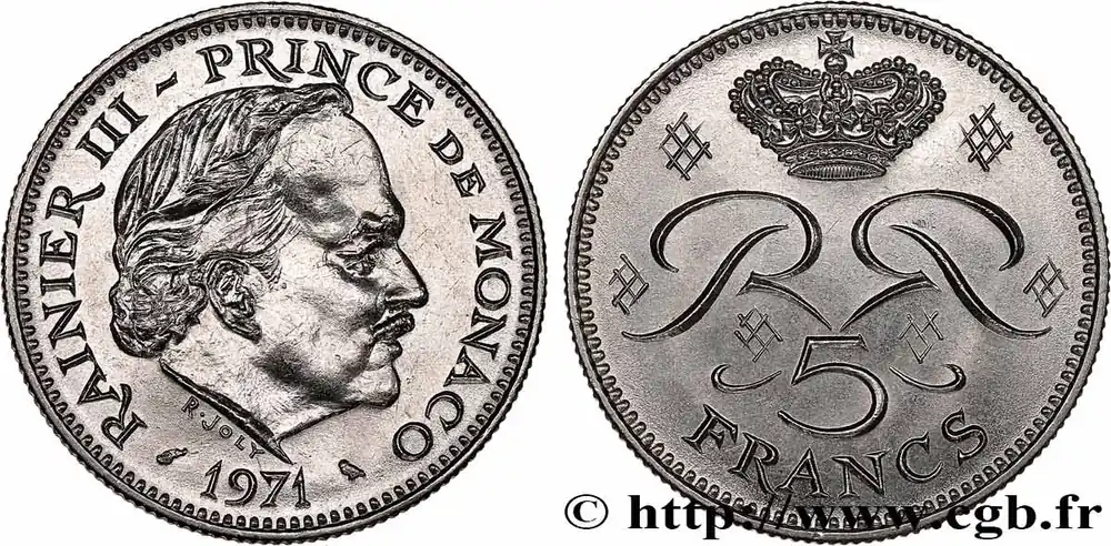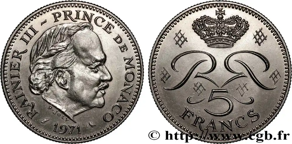 Type : 5 Francs Rainier IIIDate : 1971Nom de l’atelier/ville : ParisQuantité frappée : 250000Métal : cupro-nickelDiamètre : 29 mmAxe des coins : 6 h.Poids : 10,11 g.Tranche : striéeRéférence ouvrage :G.2019.153 – KM20/150 AversTitulature avers : RAINIER III PRINCE DE MONACO / 1971.Description avers : Tête de Rainier III à droite.ReversTitulature revers : 5 / FRANCS.Description revers : Deux R entrelacés et opposés sour une couronne princière.HistoriqueMONACO