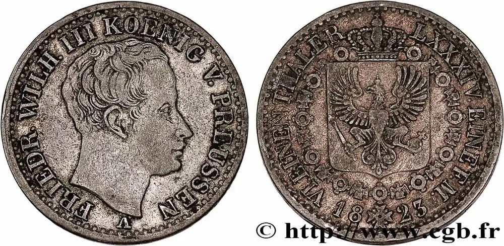 Type : 1/6 Thaler Frédéric-Guillaume IIIDate : 1812Nom de l’atelier/ville : BerlinQuantité frappée : -Métal : argentTitre en millième : 521 ‰Diamètre : 24,4 mmAxe des coins : 12 h.Poids : 5,07 g.Tranche : décoréeCommentaires sur l’état de conservation :Usure importanteRéférence ouvrage :KM.19/385  – AKS.24 AversTitulature avers : FRIEDR.WILHELM III KOENIG VON PREUSSEN.Description avers : portrait à droite de Frédéric Guillaume III de Prusse.Traduction avers : (Frédéric-Guillaume III roi de Prusse).ReversTitulature revers : VIER UNDACHTZIG EINE FEINE MARK.Description revers : couronne de chêne, inscription 6 / EINEN / REICHES / THALER / 1811 / A.Traduction revers : (1/84e de livre de fin – 1/6 de thaler).HistoriqueALLEMAGNE – PRUSSE
