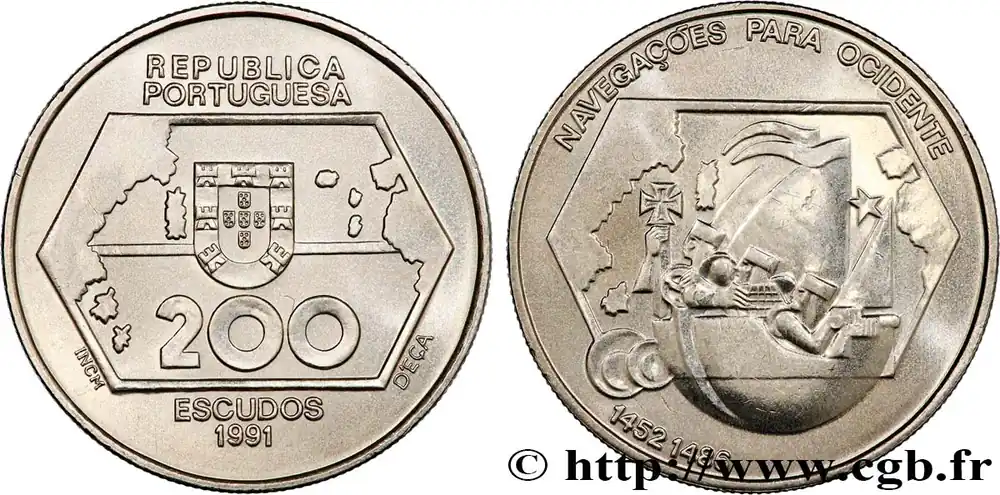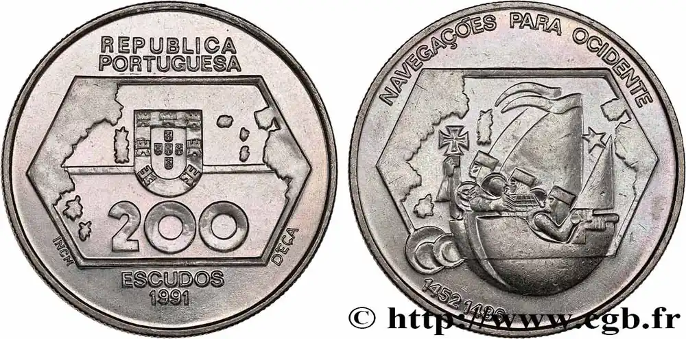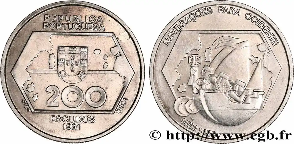 Type : 200 Escudos Navigation vers l’ouestDate : 1991Nom de l’atelier/ville : LisbonneQuantité frappée : 1500000Métal : cupro-nickelDiamètre : 36 mmAxe des coins : 6 h.Poids : 21,1 g.Tranche : canneléeRéférence ouvrage :KM20/659  – Gom.102.01 AversTitulature avers : REPUBLICA / PORTUGUESA // 200 / ESCUDOS / 1991 // INCM – D’EÇA.Description avers : vue de l’Océan Atlantique, des côtes d’Europe, d’Afrique et des Amériques, écu du Portugal.ReversTitulature revers : NAVEGAÇÕES PARA OCIDENTE // 1452 1486.Description revers : vue de l’Océan Atlantique, des côtes d’Europe, d’Afrique et des Amériques, navire à voile stylisé.HistoriquePORTUGAL