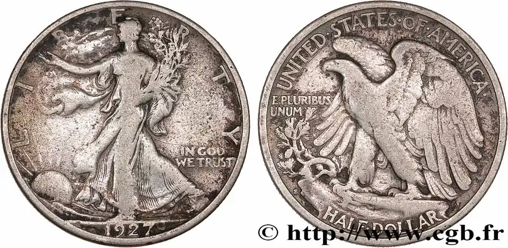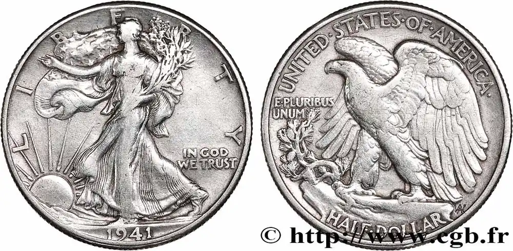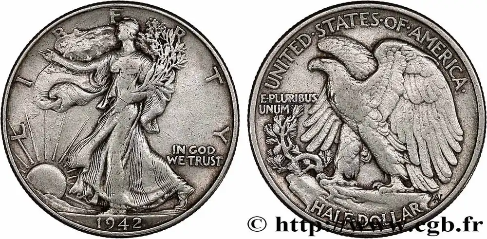 Type : 1/2 Dollar Walking LibertyDate : 1942Nom de l’atelier/ville : San FranciscoQuantité frappée : 12708000Métal : argentTitre en millième : 900 ‰Diamètre : 30,6 mmAxe des coins : 6 h.Poids : 12,5 g.Tranche : canneléeCommentaires sur l’état de conservation :coup sur trancheRéférence ouvrage :KM20/142  – Y.- AversTitulature avers : LIBERTY // (DATE).Description avers : Liberté marchant à gauche, soleil levant ; IN GOD / WE TRUST dans le champ.Traduction avers : (Liberté).ReversTitulature revers : UNITED STATES OF AMERICA // HALF DOLLAR.Description revers : aigle aux ailes déployées ; E.PLURIBUS / UNUM dans le champ à gauche.Traduction revers : (États-Unis d’Amérique // demi-dollar).HistoriqueÉTATS-UNIS D’AMÉRIQUE