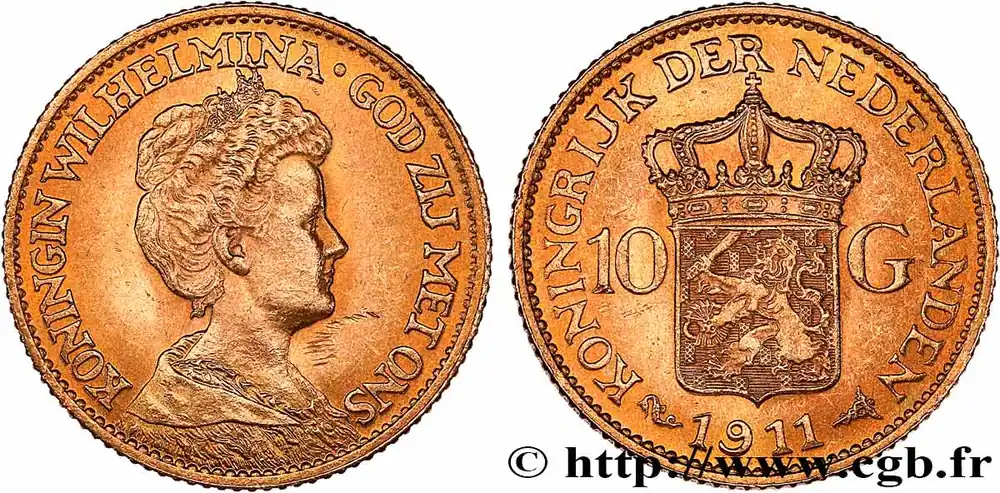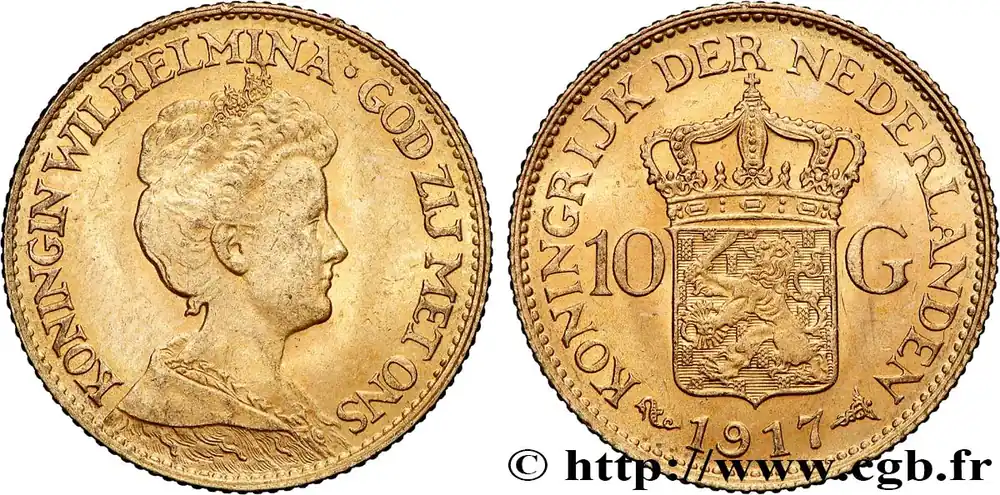 Type : 10 Gulden, 3e type WilhelminaDate : 1917Nom de l’atelier/ville : UtrechtQuantité frappée : 4000000Métal : orTitre en millième : 900 ‰Diamètre : 22,5 mmAxe des coins : 6 h.Poids : 6,71 g.Tranche : canneléeRéférence ouvrage :KM20/149 AversTitulature avers : KONINGIN WILHELMINA. GOD ZIJ MET ONS.Description avers : Buste de Wilhelmine diadémé à droite.Traduction avers : (Reine Wilhelmine. Dieu avec nous).ReversTitulature revers : KONINGRIJK DER NEDERLANDEN/ 1917.Description revers : Écu couronné accosté de 10 – G.Traduction revers : (Royaume des Pays-Bas).CommentaireCe type fut fabriqué à partir de 1911 à 1913 et en 1917.HistoriqueOR, PALLADIUM ET PLATINE INVESTISSEMENTSécurisez et diversifiez votre épargne avec les métaux précieux :Dans un contexte d’instabilité politique et économique croissante, diversifier son épargne peut être une démarche judicieuse. Les métaux précieux comme l’or, le palladium et le platine constituent des actifs tangibles souvent prisés en raison de leur caractère intemporel et de leur résilience face aux fluctuations des marchés.Pour répondre à des besoins variés, l’achat de pièces officielles en or, palladium ou platine est une option flexible et adaptée. Ces pièces, disponibles à l’unité ou en lot, permettent à chacun d’ajuster ses choix selon ses objectifs et son budget, sans engagement à long terme.Un processus simple et sécurisé :Nous proposons une livraison sécurisée et garantie. Les paiements peuvent être effectués par carte bancaire ou par virement, bien que certaines transactions puissent nécessiter un règlement exclusivement par virement bancaire. Une pièce d’identité valide (carte nationale d’identité ou passeport) sera demandée pour finaliser votre achat.Stockage en toute sécurité et confidentialité :Le département Investissement de CGB Numismatique Paris met à votre disposition des solutions de stockage offrant une sécurité renforcée et une confidentialité optimale pour vos achats en or, palladium et platine.Contactez-nous pour plus d’informations :Pour toute question ou pour passer commande, prenez contact avec notre responsable des achats/ventes de métaux précieux : par email à [email protected] ou par téléphone. Nous mettons à votre disposition des informations générales et des services pour vous accompagner dans vos projets d’investissement.CGB Numismatique Paris agit en tant que fournisseur de métaux précieux et ne fournit aucun conseil en investissement. La valeur des métaux précieux peut fluctuer, et les performances passées ne garantissent pas les résultats futurs. L’achat de métaux précieux doit être considéré comme une stratégie de préservation de valeur plutôt qu’un investissement spéculatif. Conformément à l’article L.221-28 du Code de la consommation, le droit de rétractation ne s’applique pas aux achats d’or d’investissement, dont le prix dépend des fluctuations des marchés financiers.
