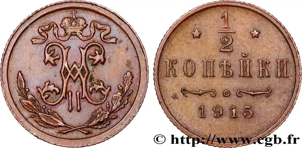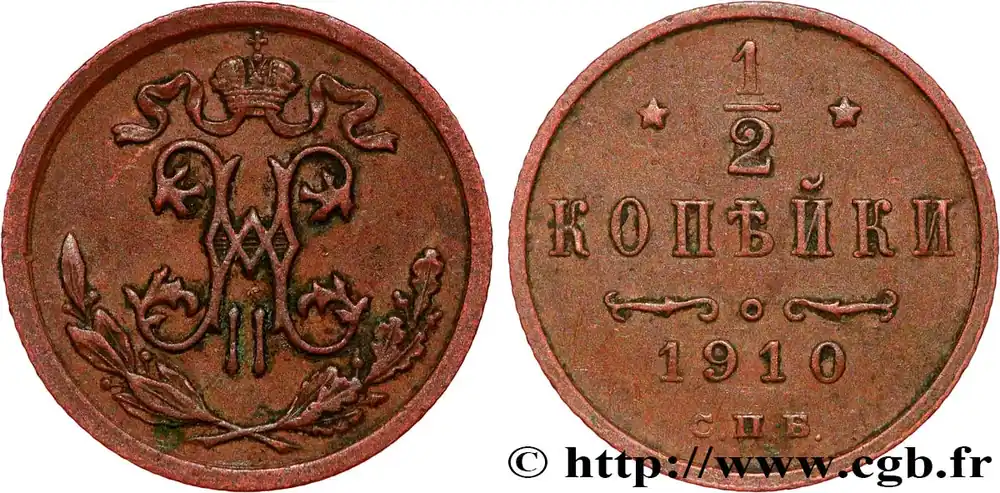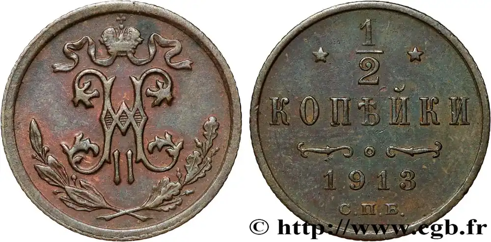 Type : 1/2 Kopeck Nicolas IIDate : 1912Nom de l’atelier/ville : Saint-PetersbourgQuantité frappée : 28000000Métal : cuivreDiamètre : 16 mmAxe des coins : 12 h.Poids : 1,67 g.Tranche : striéeRéférence ouvrage :KM20/48.1 AversTitulature avers : Н / II.Description avers : monogramme couronné du tsar Nicolas II, rameaux.ReversTitulature revers : (LÉGENDE EN CYRILLIQUE) * 1/2 * / КОПѢЙКИ / 1912 / С. П. Б..Description revers : dans le champ.HistoriqueRUSSIE
