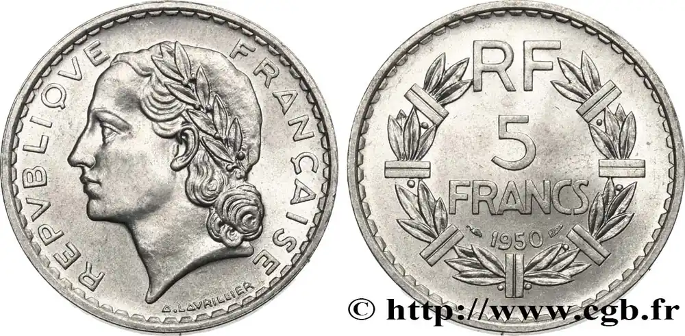 Type : 5 francs Lavrillier, aluminiumDate : 1950Nom de l’atelier/ville : Beaumont-Le-RogerQuantité frappée : 28.952.000Métal : aluminiumDiamètre : 31 mmAxe des coins : 6 h.Poids : 3,80 g.Tranche : lisseRéférence ouvrage :Classement FRANC 2023 / FRANC 2023 classificationF.339/21AversTitulature avers : REPVBLIQVE FRANÇAISE.Description avers : tête laurée de la République aux cheveux longs à gauche ; au-dessous signé A. LAVRILLIER le long du listel.ReversTitulature revers : RF / 5 / FRANCS / (MILLÉSIME).Description revers : en quatre lignes dans le champ au-dessus du millésime encadré des différents, le tout dans une couronne de laurier ornée de sept bagues.Commentaire9 fermé.HistoriqueQUATRIÈME RÉPUBLIQUE(16/01/1947-8/01/1959) Se caractérisant par un régime parlementaire doublé d’une grande instabilité ministérielle, la Quatrième République a pour particularité de n’avoir jamais été officiellement proclamée. En effet, De Gaulle, lors de son arrivée à Paris le 25 août 1944, refuse de le faire sous prétexte que la République n’avait jamais cessé d’exister. Considérant que l’État français du maréchal Pétain n’était qu’un simple état de fait, il estime que la République a survécu dans la France libre et son acte de naissance doit alors être le 18 juin 1940. Toutefois, son départ, le 20 janvier 1946, et le référendum du 13 octobre 1946 approuvant une nouvelle Constitution, marquent le début officiel de cette république. Elle connaît deux présidents : Vincent Auriol (16/01/1947 – 23/12/1953) et René Coty (23/12/1953 – 8/1/1959). La crise ouverte causée par la révolte de l’armée d’Algérie entraîne, en 1958, sa chute qui est confirmée par l’adoption d’une nouvelle constitution le 28 septembre 1958. Néanmoins, elle ne cesse définitivement d’être que le 8 janvier 1959 lors de l’installation du général de Gaulle comme président de la Ve République.