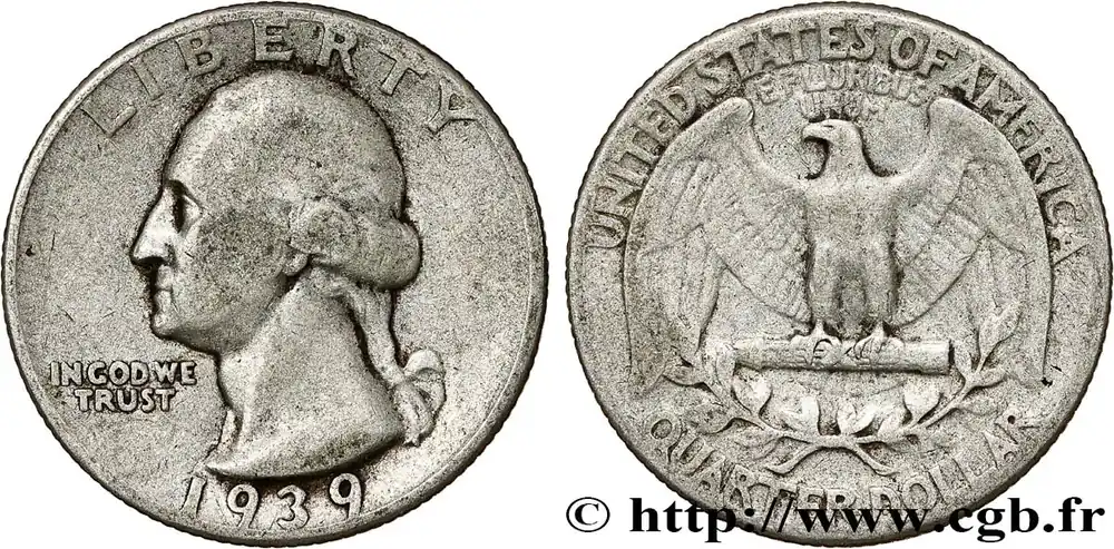 Type : 1/4 Dollar Georges WashingtonDate : 1942Nom de l’atelier/ville : PhiladelphieQuantité frappée : 102096000Métal : argentTitre en millième : 900 ‰Diamètre : 24,3 mmAxe des coins : 6 h.Poids : 6,19 g.Tranche : striéeRéférence ouvrage :KM20/164 – Y.- AversTitulature avers : LIBERTY // IN GOD WE / TRUST // 1942.Description avers : portrait de Georges Washington à gauche.ReversTitulature revers : UNITED STATES OF AMERICA / E PLURIBUS / UNUM // QUARTER DOLLAR.Description revers : aigle aux ailes déployées posé sur un faisceau, rameaux.HistoriqueÉTATS-UNIS D’AMÉRIQUE