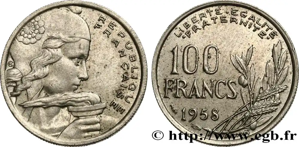 Type : 100 francs CochetDate : 1957Quantité frappée : 11.312.000Métal : cupro-nickelDiamètre : 24 mmAxe des coins : 6 h.Poids : 5,99 g.Tranche : canneléeCommentaires sur l’état de conservation :NettoyéRéférence ouvrage :Classement FRANC 2023 / FRANC 2023 classificationF.450/10AversTitulature avers : REPUBLIQUE / FRANÇAISE.Description avers : buste de Marianne aux cheveux longs à droite, coiffée du bonnet phrygien timbré d’une cocarde tricolore en pétales (centre guilloché en cercles concentriques, cercle de pétales lisses, cercle de pétales guillochées centrifuges), tenant un flambeau allumé dans le vent, signé RC en monogramme derrière la nuque.ReversTitulature revers : LIBERTE . EGALITE / .FRATERNITE. EN DEUX LIGNES, 100 FRANCS (MILLÉSIME) EN TROIS LIGNES, DIFFÉRENTS SOUS LE MILLÉSIME CONTRE LE LISTEL.Description revers : bouquet de trois épis et deux branches d’olivier chargées de fruits à droite, signé R. COCHET au-dessous contre le listel.HistoriqueQUATRIÈME RÉPUBLIQUE(16/01/1947-8/01/1959) Se caractérisant par un régime parlementaire doublé d’une grande instabilité ministérielle, la Quatrième République a pour particularité de n’avoir jamais été officiellement proclamée. En effet, De Gaulle, lors de son arrivée à Paris le 25 août 1944, refuse de le faire sous prétexte que la République n’avait jamais cessé d’exister. Considérant que l’État français du maréchal Pétain n’était qu’un simple état de fait, il estime que la République a survécu dans la France libre et son acte de naissance doit alors être le 18 juin 1940. Toutefois, son départ, le 20 janvier 1946, et le référendum du 13 octobre 1946 approuvant une nouvelle Constitution, marquent le début officiel de cette république. Elle connaît deux présidents : Vincent Auriol (16/01/1947 – 23/12/1953) et René Coty (23/12/1953 – 8/1/1959). La crise ouverte causée par la révolte de l’armée d’Algérie entraîne, en 1958, sa chute qui est confirmée par l’adoption d’une nouvelle constitution le 28 septembre 1958. Néanmoins, elle ne cesse définitivement d’être que le 8 janvier 1959 lors de l’installation du général de Gaulle comme président de la Ve République.