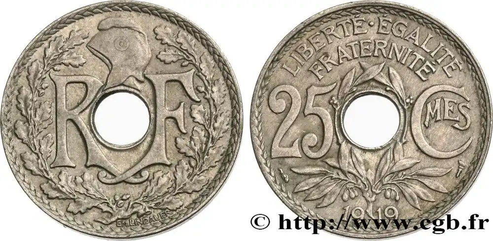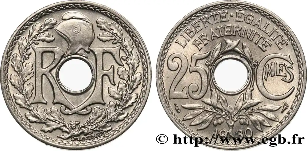 Type : 25 centimes LindauerDate : 1917Quantité frappée : 3084721Métal : cupro-nickelDiamètre : 24 mmAxe des coins : 6 h.Poids : 5,04 g.Tranche : lisseRéférence ouvrage :Classement FRANC 2023 / FRANC 2023 classificationF.171/1AversTitulature avers : R-F AUTOUR D’UN ROND PERFORÉ.Description avers : Bonnet phrygien à gauche orné d’une cocarde, dans une couronne formée de deux branches de chêne nouées par un ruban ; signé au-dessous EM. LINDAUER.ReversTitulature revers : LIBERTÉ. ÉGALITÉ / FRATERNITÉ / 25 – CMES / 19-17.Description revers : Branche d’olivier entourant un rond perforé.HistoriqueTROISIÈME RÉPUBLIQUE(4/09/1870-10/07/1940) La nouvelle de la capitulation de Sedan provoque la révolution du 4 septembre 1870 à Paris. Proclamée à l’Hôtel de Ville, la République est dotée d’un gouvernement provisoire appelé gouvernement de la Défense nationale. Menacé à gauche par l’insurrection de la Commune et à droite par les monarchistes, le nouveau régime connaît des débuts difficiles. Chef du pouvoir exécutif dans un premier temps (février 1871), Thiers est chargé de réorganiser le pays avant de choisir sa forme de gouvernement. Il devient président de la République en août 1871 et, malgré son action de libération du territoire, doit quitter son poste en mars 1873 face à l’opposition royaliste. Il est alors remplacé par Mac-Mahon favorable au rétablissement de la monarchie mais celle-ci n’est pas restaurée à la suite de la question du drapeau. La loi du septennat est alors mise en place en novembre 1873 puis, en 1875, sont votées les lois fondamentales qui servent de Constitution à la Troisième République. Régime parlementaire, elle se caractérise notamment par la nette prépondérance du pouvoir législatif sur le pouvoir exécutif. Anticléricale, la Troisième République rend l’école gratuite, laïque et obligatoire mais continue la politique coloniale pour ses ambitions économiques, stratégiques et morales. La séparation des Églises et de l’État est votée en 1905. L’idée d’une revanche sur l’Allemagne et un nationalisme important sont au cœur de la crise boulangiste, du scandale de Panama ou de l’affaire Dreyfus des années 1886-1899 tandis que la politique étrangère est très active notamment au Maroc et que la course aux armements se développe. La Première Guerre mondiale coûte cher à la France qui ne se relève qu’à partir de 1920 voire 1928 pour la monnaie avec le franc « Poincaré ». La crise de 1929 ne se fait sentir qu’à partir de 1932 mais dure jusqu’en 1939, période durant laquelle l’instabilité ministérielle est très importante. Vacillant en 1934, la Troisième République trouve un nouveau ciment unitaire avec l’antifascisme qui permet l’arrivée au pouvoir du Front populaire en 1936. Mais, paralysée face à l’Allemagne, la France va alors s’enliser dans une « drôle de guerre » puis connaître l’une des plus grandes défaites de son histoire en juin 1940. Réunies en Assemblée nationale à Vichy le 10 juillet 1940, les Chambres, pourtant élues en 1936, votent les pleins pouvoirs à Pétain dans une sorte de suicide collectif par 569 voix pour, 80 voix contre et 18 abstentions.