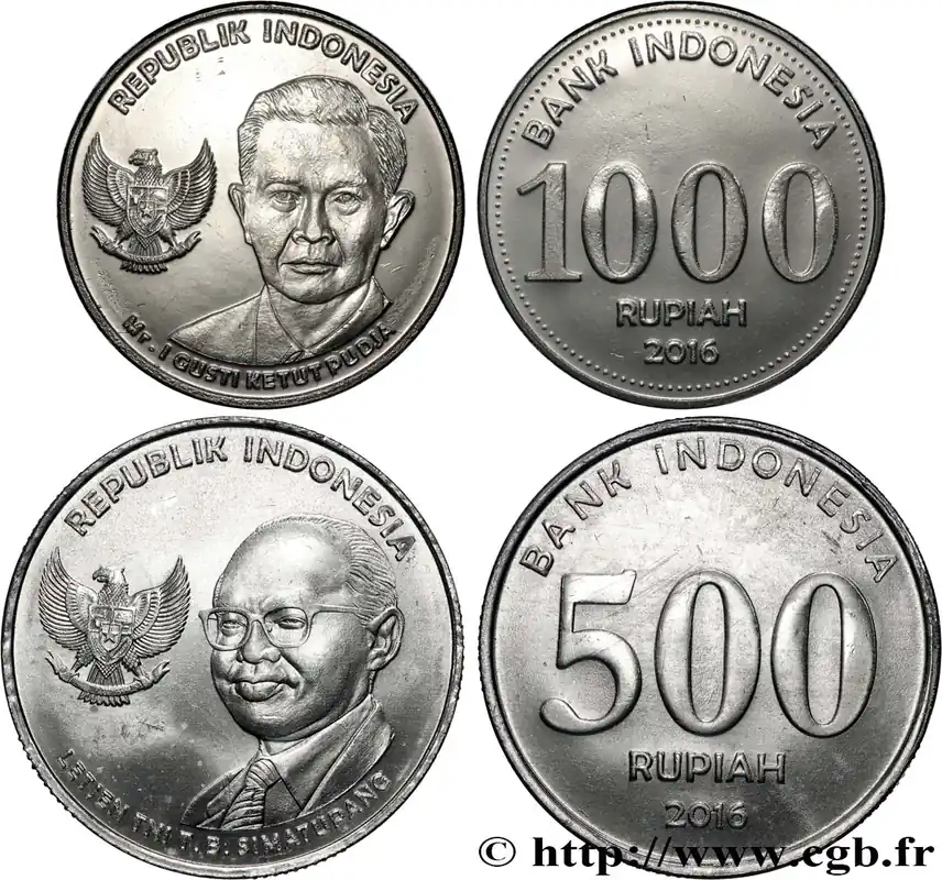 Type : Lot 500 et 1000 RupiahDate : 2016Quantité frappée : -Axe des coins : 6 h.Poids : 7,60 g.Tranche : striéeRéférence ouvrage :KM20/73-74 AversTitulature avers : REPUBLIK INDONESIA // LETJEN TNI T. B. SIMATUPANG (MR. I GUSTI KETUT PUDJA).Description avers : Emblème et buste de Tahi Bonar Simatupan ou de I Gusti Ketut Pudja.Traduction avers : 25e anniversaire de l’indépendance République d’Indonésie.ReversTitulature revers : BANK INDONESIA // 500 (1000) / RUPIAH // 2016.Description revers : emblème national.CommentaireComprend deux monnaies datées 2016 :- 500 Rupiah Tahi Bonar Simatupan, aluminium, 3,10g, Ø 27,2 mm, KM# 73- 1000 Rupîah I Gusti Ketut Pudja, acier plaqué nickel, 4,50g, Ø 27,2 mm, KM# 74.HistoriqueINDONÉSIE