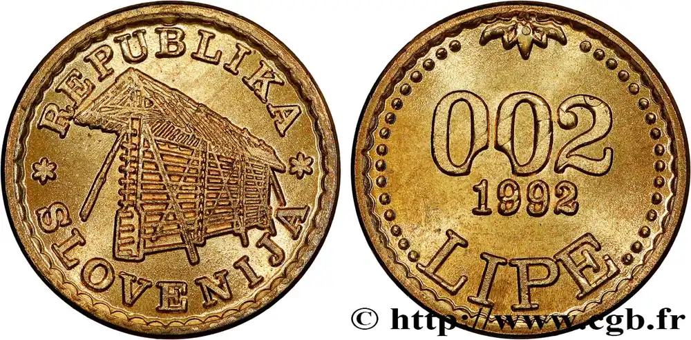 Type : 0,02 Lipe (monnaie non adoptée)Date : 1992Quantité frappée : -Métal : laitonDiamètre : 18,40 mmAxe des coins : 12 h.Tranche : lisseRéférence ouvrage :UNWCTn5 AversTitulature avers : REPUBLIKA // SLOVENIA.Description avers : Séchoir à maïs.ReversTitulature revers : 002 / 1992 / LIPE.Description revers : sur trois lignes dans le champ.CommentaireLe projet d’une monnaie slovène, le Lipa (tilleul en langue slovène), a été initiée en 1989 par le Dr. Bogdan Oblak-Hamurabi dès les prémices de l’éclatement de la Fédération Yougoslave. En 1991, la nouvelle monnaie slovène adopte le nom de Tolar (thaler en langue slovène) qui entrera en circulation en 1992.Le Lipa n’a jamais été adoptée et n’a donc pas de caractère officiel. Certaines de ces monnaies auraient été frappées sur des monnaies yougoslaves de 10 para 1990.HistoriqueSLOVÉNIE