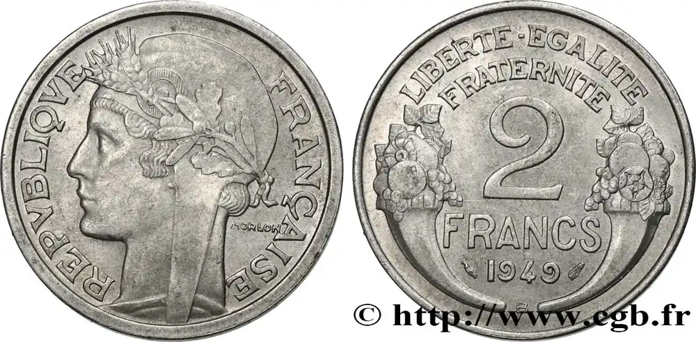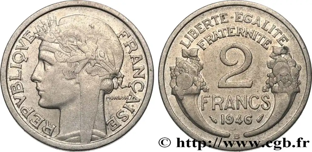 Type : 2 francs Morlon, aluminiumDate : 1945Nom de l’atelier/ville : Beaumont-Le-RogerQuantité frappée : 1.726.144Métal : aluminiumDiamètre : 27 mmAxe des coins : 6 h.Poids : 2,19 g.Tranche : lisseCommentaires sur l’état de conservation :Droit en partie corrodéRéférence ouvrage :Classement FRANC 2023 / FRANC 2023 classificationF.269/6AversTitulature avers : REPVBLIQVE FRANÇAISE.Description avers : buste drapé de la République aux cheveux courts à gauche, coiffée d’un bonnet phrygien orné d’une cocarde tricolore (centre guilloché, cercle lisse, cercle guilloché), sous une couronne composite de blé, chêne et olivier nouée par un ruban ; sous le ruban MORLON.ReversTitulature revers : LIBERTE – EGALITE / FRATERNITE.Description revers : 2 / FRANCS, en deux lignes au-dessus du millésime encadré des différents, le tout entre deux cornes d’abondance symétriquement opposées.HistoriqueGOUVERNEMENT PROVISOIRE DE LA RÉPUBLIQUE FRANÇAISE(26/08/1944-16/01/1947) Le Gouvernement Provisoire de la République Française (G.P.R.F.) est le nom donné au Comité Français de Libération Nationale (C.F.L.N.) dirigé par le général de Gaulle depuis juin 1944 et en prévision du débarquement allié. Reconnu par les États-Unis, peu à peu, le Gouvernement Provisoire de la République Française voit son autorité s’étendre aux régions libérées. Ce gouvernement est installé à Paris le 31 août 1944 et est remanié en septembre pour permettre l’entrée de personnalités issues de la résistance intérieure. Ce gouvernement reste en fonction jusqu’au 16 janvier 1947, date de l’élection de Vincent Auriol à la présidence de la Quatrième République. À sa tête se succédent le général de Gaulle, Félix Gouin, Georges Bidault et Léon Blum.