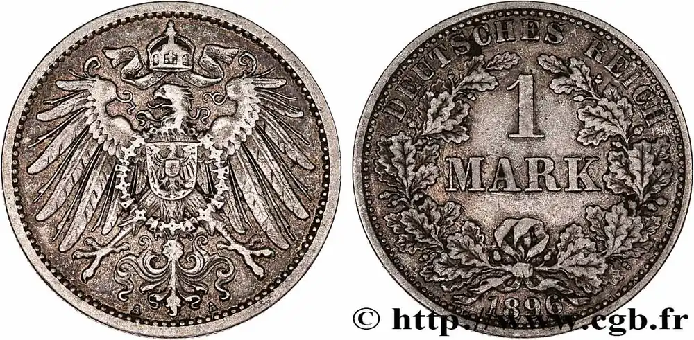Type : 1 Mark Empire aigle impérial 2e typeDate : 1909Nom de l’atelier/ville : BerlinQuantité frappée : 4150849Métal : argentTitre en millième : 900 ‰Diamètre : 24 mmAxe des coins : 12 h.Poids : 5,55 g.Tranche : canneléeRéférence ouvrage :KM.19/14 – AKS.2 AversTitulature avers : (LETTRE D’ATELIER).Description avers : aigle impériale.ReversTitulature revers : DEUTSCHES REICH // 1 / MARK // (DATE).Description revers : dans le champ, entre deux rameaux de chêne.HistoriqueALLEMAGNE