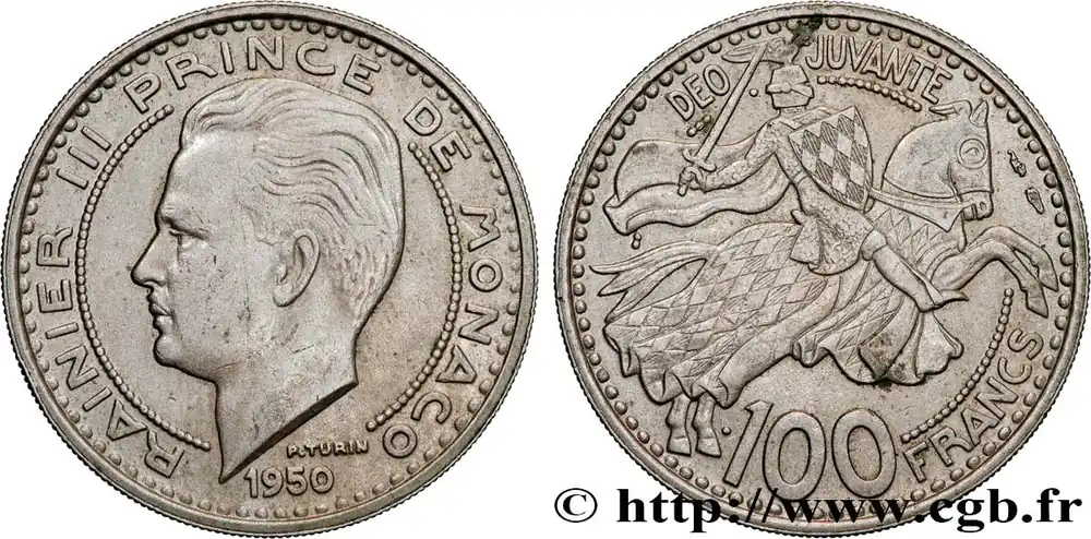Type : 100 Francs Rainier IIIDate : 1950Nom de l’atelier/ville : ParisQuantité frappée : 500000Métal : cupro-nickelDiamètre : 30 mmAxe des coins : 6 h.Poids : 12,00 g.Tranche : lisseRéférence ouvrage :G.2019.142  – KM20/115 AversTitulature avers : RAINIER III PRINCE DE MONACO // 1950.Description avers : Portrait du prince à gauche, dans un grènetis, la pointe du buste coupant celui-ci.ReversTitulature revers : DEO JUVANTE / 100 FRANCS.Description revers : Cavalier levant une épée, portant les armes des Grimaldi, sur un cheval caparaçonné, à l’attaque à droite, dans un grènetis intérieur limité aux légendes.HistoriqueMONACO
