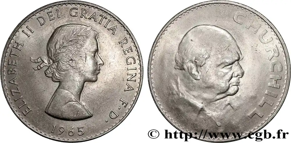 Type : 1 Crown Winston ChurchillDate : 1965Quantité frappée : 9640000Métal : cupro-nickelDiamètre : 38,61 mmAxe des coins : 12 h.Poids : 28,20 g.Tranche : striéeRéférence ouvrage :KM20/910 AversTitulature avers : ELIZABETH II DEI GRATIA REGINA D. F. / 1965.Description avers : Buste à droite lauré de la reine Élisabeth II.ReversTitulature revers : CHURCHILL.Description revers : portrait de trois quart à droite de Winston Churchill.HistoriqueROYAUME-UNI