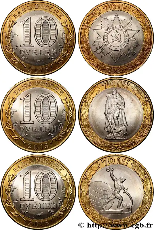 Type : Lot de 3 x 10 Roubles70 ans de la fin de la Grande Guerre PatriotiqueDate : 2015Nom de l’atelier/ville : MoscouQuantité frappée : -Métal : bimétalliqueDiamètre : 27 mmAxe des coins : 12 h.Poids : 25,80 g.Tranche : cannelée et inscription en creuxRéférence ouvrage :KM21/- AversTitulature avers : БАНК РОССИИ / 10 / РУБЛЕЙ / 2015.Description avers : inscription “10 ROUBLES” en russe avec image latente “10” et “PYb” dans la boucle du zéro .Légende avers : БАНК РОССИИ / 10 / РУБЛЕЙ / 2015Traduction avers : BANQUE DE RUSSIE // 2015.ReversTitulature revers : 70 ЛЕТ.Description revers : Ordre de la Guerre Patriotique / Monument du soldat Libérateur de Treptower Park (Berlin) / transformation de l’épée en soc.Légende revers : 70 ЛЕТTraduction revers : (70 ans).CommentaireCe lot comprend trois monnaies bimétalliques de 10 roubles commémorant les 70 ans de la fin de la Grande Guerre Patriotique.HistoriqueRUSSIE