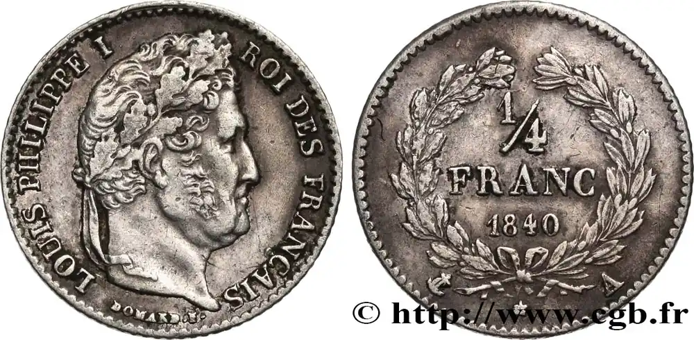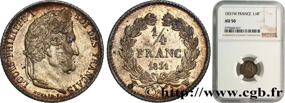 Type : 1/4 franc Louis-PhilippeDate : 1839Nom de l’atelier/ville : BordeauxQuantité frappée : 15517Métal : argentTitre en millième : 900 ‰Diamètre : 14,96 mmAxe des coins : 6 h.Poids : 1,21 g.Tranche : canneléeDegré de rareté : R2SlabNGC : Commentaires sur l’état de conservation :Sous coque NGC Obv Scratched – AU DetailRéférence ouvrage :Classement FRANC 2023 / FRANC 2023 classificationF.166/78Pedigree :Cet exemplaire provient des Collections William Applegate et Robert Laviana, Esq.AversTitulature avers : LOUIS PHILIPPE I ROI DES FRANÇAIS.Description avers : Tête de Louis-Philippe Ier à droite, portant une couronne de chêne terminée par un ruban descendant le long du cou, l’une des extrémités revenant sur le cou ; au-dessous DOMARD. F. le long du listel.ReversTitulature revers : 1/4 / FRANC.Description revers : en deux lignes, au-dessus de 1839, le tout dans une couronne nouée par un ruban à sa base, formée à gauche d’une branche de laurier, à droite d’une branche d’olivier ; au-dessous différent du graveur général encadré de la lettre d’atelier K à droite et du différent de maître à gauche.HistoriqueLOUIS-PHILIPPE Ier(7/08/1830-24/02/1848) Né à Paris en 1773, Louis-Philippe est le fils aîné de Louis-Philippe Joseph, duc d’Orléans (Philippe-Égalité), guillotiné en 1793 pour corruption après avoir voté la mort de son cousin Louis XVI. Il porte successivement les titres de duc de Valois, de Chartres puis d’Orléans à compter de 1793. Favorable à la Révolution, comme son père, il doit néanmoins se réfugier en Suisse puis il voyage en Scandinavie, aux États-Unis et enfin s’établit en Angleterre en 1801. La Restauration lui permet de retrouver les biens immenses de sa famille mais il reste considéré comme un rival potentiel par Louis XVIII qui le reçoit froidement. Réfugié en Angleterre lors des Cent-Jours, il revient en France en 1817. Âpre au gain, il donne son appui à l’opposition représentée par le parti libéral tout en s’appuyant sur la haute bourgeoisie possédante. Les journées de 1830 lui donnent l’occasion d’accéder au pouvoir après avoir adhéré au drapeau tricolore et multiplié les promesses. Il devient le 31 juillet 1830 lieutenant général du royaume puis roi des Français le 7 août. Son règne, sous une apparence libérale, va devenir celui de la bourgeoisie et des milieux d’affaires tandis que les oppositions (légitimistes, bonapartistes, républicaines et socialistes) sont maintenues dans l’illégalité. Sa politique de paix et son autorité lui valent alors un prestige important auprès des cours européennes. Le banquier Laffitte est Premier ministre. La Fayette est l’un des artisans de cette « révolution bourgeoise ». Le 13 mars 1831, Casimir Périer remplace Laffitte. La France intervient en Belgique en août 1831 pour contrer les Hollandais. Les Légitimistes, avec le complot de la rue des Prouvaires, tentent d’établir Henri V comme roi tandis que sa mère essaie de soulever la Vendée. Elle est arrêtée le 3 décembre 1832 à Nantes. L’épidémie de choléra tue plus de dix mille personnes à Paris, dont Casimir Périer. Les obsèques du général Lamarque sont l’occasion d’une tentative de soulèvement républicain, écrasé dans le sang (cf. Les Misérables). Les Français occupent Anvers le 23 décembre 1832. L’attentat de Fieschi du 28 juillet 1835 contre Louis-Philippe tue dix-huit personnes dont le maréchal Mortier. La première ligne de chemin de fer Paris-Orléans et la colonne de Juillet sont inaugurées respectivement les 24 octobre 1837 et 28 juillet 1840. L’année 1840 marque un tournant dans le régime, d’une grande instabilité ministérielle avant d’avoir le ministère Guizot (« Enrichissez-vous ! »). Le prince Louis-Napoléon Bonaparte, après une seconde tentative de putsch, est condamné à la réclusion perpétuelle et enfermé au fort de Ham dont il s’échappera en 1846. Les cendres de Napoléon sont ramenées de Sainte-Hélène et transférées aux Invalides. À partir de 1841, Louis-Philippe engage la France sur la voie de la conquête totale de l’Algérie, déjà commencée sous Charles X, tandis que se développe un important essor économique en Métropole. Une loi limite en 1841 le travail des enfants à 12 heures. Le premier accident grave de chemin de fer a lieu sur la ligne Paris-Versailles et fait 45 morts le 8 mai 1842. Le 13 juillet, le duc d’Orléans, fils aîné du roi, meurt accidentellement. Le 16 mai 1843, le duc d’Aumale prend la smala d’Abd-el-Kader qui parvient à s’enfuir. Bugeaud, gouverneur de l’Algérie, est fait Maréchal. 1843, c’est aussi le début de l’Entente Cordiale et la visite de la reine Victoria en France. Les Français battent les Marocains à Isly. Abd-el-Kader se rend le 23 décembre 1847. Le refus de réformes entraîne la chute du régime lors de la Campagne des Banquets et Louis-Philippe, détrôné le 24 février 1848, se réfugie en Angleterre après avoir abdiqué en faveur de son petit-fils.