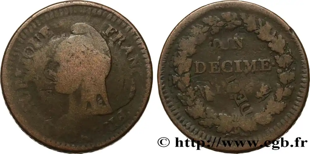 Type : Un décime Dupré, grand module, « refrappage » du 2 décimesDate : An 5 (1796-1797)Nom de l’atelier/ville : ParisQuantité frappée : 12463719Métal : cuivreDiamètre : 32,48 mmAxe des coins : 6 h.Poids : 20,73 g.Tranche : macléeRéférence ouvrage :Classement FRANC 2023 / FRANC 2023 classificationF.128/1AversTitulature avers : REPUBLIQUE FRANÇAISE..Description avers : Buste drapé de la Liberté à gauche coiffée du bonnet phrygien (Mesdames Tallien ou Récamier) ; signé Dupré cursif au-dessous.ReversTitulature revers : UN / DÉCIME..Description revers : En deux lignes dans le champ, au-dessus de L’AN 5 suivi d’un point et de la lettre d’atelier A encadrés des différents, dans une couronne fermée composée de deux branches de chêne opposées nouées à leur base par un ruban.HistoriqueDIRECTOIRE(26/10/1795-9-10/11/1799) Lors de la séparation de la Convention, le 25 octobre 1795, un nouveau pouvoir exécutif prévu par la constitution thermidorienne se met en place. Cette constitution prévoit de confier le pouvoir à un directoire de cinq membres dont chacun préside à tour de rôle avec remplacement d’un membre tous les deux ans. Ce directoire nomme les ministres et les fonctionnaires, dirige la politique étrangère et fait exécuter les lois mais il ne les élabore pas et n’a aucun contrôle des deniers publics. Le pouvoir est partagé avec deux chambres : le Conseil des Cinq-Cents et le Conseil des Anciens qui forment le Corps législatif. Ce pouvoir est résolu à se maintenir face au risque d’une restauration monarchique ou d’une réaction jacobine mais il est surtout paralysé par la crise financière et doit renoncer à l’assignat en 1796. Le remplacement des assignats par les mandats territoriaux n’inspire pas plus de confiance et cette nouvelle monnaie fiduciaire est supprimée en 1797. Face à la misère et aux tentatives de déstabilisation, le Directoire, accusé d’être une « république bourgeoise », revient aux mesures révolutionnaires et policières. Par ailleurs, depuis 1792, la guerre est ininterrompue et l’influence des chefs militaires est croissante. En 1799, les partisans d’un pouvoir fort, dont Sieyès, se retrouvent au Directoire et ils ouvrent la voie du pouvoir à Bonaparte, de retour d’Égypte. Le coup d’État des 18 et 19 brumaire an VIII permet l’instauration d’une dictature militaire sous le nom de Consulat.
