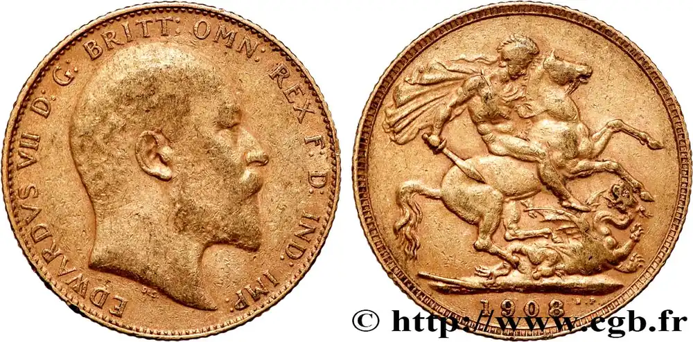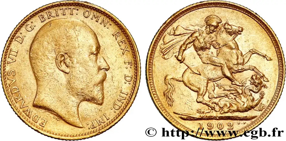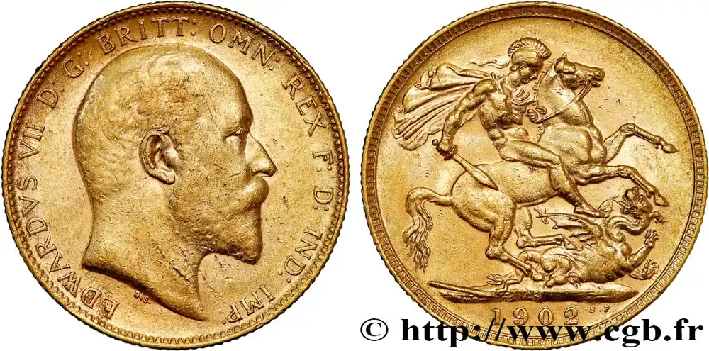 Type : 1 Souverain Edouard VIIDate : 1908Nom de l’atelier/ville : LondresQuantité frappée : 11729000Métal : orTitre en millième : 917 ‰Diamètre : 22 mmAxe des coins : 12 h.Poids : 7,98 g.Tranche : canneléeRéférence ouvrage :KM20/805 AversTitulature avers : EDWARDVS VII D: G: BRITT: OMN: REX F. D. IND: IMP:.Description avers : Tête nue d’Édouard VII à droite.Traduction avers : (Édouard VII par la grâce de Dieu roi de tous les Bretons, défenseur de la Foi, empereur des Indes).ReversTitulature revers : À L’EXERGUE : 1908.Description revers : Saint Georges, nu, casqué, le manteau flottant sur l’épaule, tenant un glaive de la main droite, galopant à droite, terrassant un dragon.HistoriqueOR, PALLADIUM ET PLATINE INVESTISSEMENTSécurisez et diversifiez votre épargne avec les métaux précieux :Dans un contexte d’instabilité politique et économique croissante, diversifier son épargne peut être une démarche judicieuse. Les métaux précieux comme l’or, le palladium et le platine constituent des actifs tangibles souvent prisés en raison de leur caractère intemporel et de leur résilience face aux fluctuations des marchés.Pour répondre à des besoins variés, l’achat de pièces officielles en or, palladium ou platine est une option flexible et adaptée. Ces pièces, disponibles à l’unité ou en lot, permettent à chacun d’ajuster ses choix selon ses objectifs et son budget, sans engagement à long terme.Un processus simple et sécurisé :Nous proposons une livraison sécurisée et garantie. Les paiements peuvent être effectués par carte bancaire ou par virement, bien que certaines transactions puissent nécessiter un règlement exclusivement par virement bancaire. Une pièce d’identité valide (carte nationale d’identité ou passeport) sera demandée pour finaliser votre achat.Stockage en toute sécurité et confidentialité :Le département Investissement de CGB Numismatique Paris met à votre disposition des solutions de stockage offrant une sécurité renforcée et une confidentialité optimale pour vos achats en or, palladium et platine.Contactez-nous pour plus d’informations :Pour toute question ou pour passer commande, prenez contact avec notre responsable des achats/ventes de métaux précieux : par email à [email protected] ou par téléphone. Nous mettons à votre disposition des informations générales et des services pour vous accompagner dans vos projets d’investissement.CGB Numismatique Paris agit en tant que fournisseur de métaux précieux et ne fournit aucun conseil en investissement. La valeur des métaux précieux peut fluctuer, et les performances passées ne garantissent pas les résultats futurs. L’achat de métaux précieux doit être considéré comme une stratégie de préservation de valeur plutôt qu’un investissement spéculatif. Conformément à l’article L.221-28 du Code de la consommation, le droit de rétractation ne s’applique pas aux achats d’or d’investissement, dont le prix dépend des fluctuations des marchés financiers.