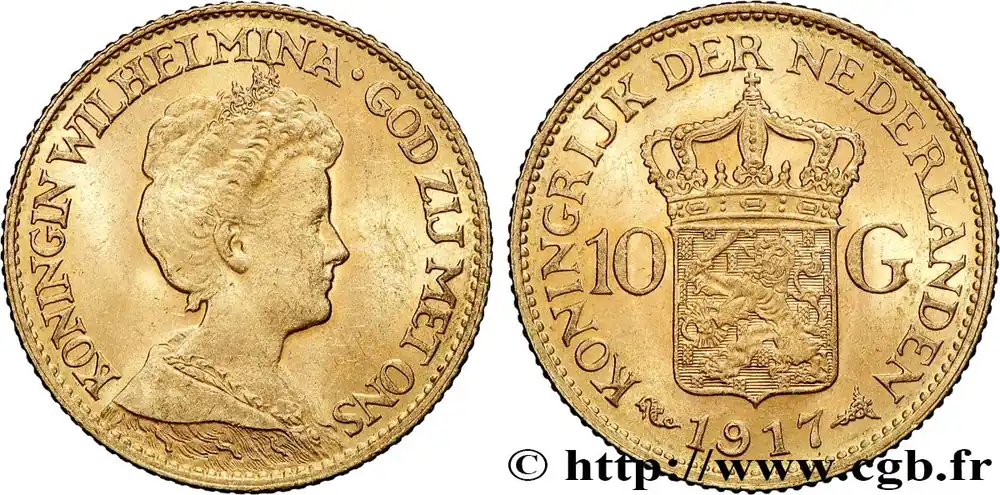 Type : 10 Gulden, 3e type WilhelminaDate : 1911Nom de l’atelier/ville : UtrechtQuantité frappée : 774544Métal : orTitre en millième : 900 ‰Diamètre : 22 mmAxe des coins : 6 h.Poids : 6,73 g.Tranche : canneléeRéférence ouvrage :KM20/149 AversTitulature avers : KONINGIN WILHELMINA – GOD ZIJ MET ONS.Description avers : Buste diadémé et drapé de Wilhelmine à droite.Traduction avers : (Wilhelmine reine) – Dieu est avec nous.ReversTitulature revers : KONINGRIJK DER NEDERLANDEN/ 1911.Description revers : Écu couronné accosté de 10 – G.Traduction revers : (Royaume des Pays Bas).HistoriqueOR, PALLADIUM ET PLATINE INVESTISSEMENTSécurisez et diversifiez votre épargne avec les métaux précieux :Dans un contexte d’instabilité politique et économique croissante, diversifier son épargne peut être une démarche judicieuse. Les métaux précieux comme l’or, le palladium et le platine constituent des actifs tangibles souvent prisés en raison de leur caractère intemporel et de leur résilience face aux fluctuations des marchés.Pour répondre à des besoins variés, l’achat de pièces officielles en or, palladium ou platine est une option flexible et adaptée. Ces pièces, disponibles à l’unité ou en lot, permettent à chacun d’ajuster ses choix selon ses objectifs et son budget, sans engagement à long terme.Un processus simple et sécurisé :Nous proposons une livraison sécurisée et garantie. Les paiements peuvent être effectués par carte bancaire ou par virement, bien que certaines transactions puissent nécessiter un règlement exclusivement par virement bancaire. Une pièce d’identité valide (carte nationale d’identité ou passeport) sera demandée pour finaliser votre achat.Stockage en toute sécurité et confidentialité :Le département Investissement de CGB Numismatique Paris met à votre disposition des solutions de stockage offrant une sécurité renforcée et une confidentialité optimale pour vos achats en or, palladium et platine.Contactez-nous pour plus d’informations :Pour toute question ou pour passer commande, prenez contact avec notre responsable des achats/ventes de métaux précieux : par email à [email protected] ou par téléphone. Nous mettons à votre disposition des informations générales et des services pour vous accompagner dans vos projets d’investissement.CGB Numismatique Paris agit en tant que fournisseur de métaux précieux et ne fournit aucun conseil en investissement. La valeur des métaux précieux peut fluctuer, et les performances passées ne garantissent pas les résultats futurs. L’achat de métaux précieux doit être considéré comme une stratégie de préservation de valeur plutôt qu’un investissement spéculatif. Conformément à l’article L.221-28 du Code de la consommation, le droit de rétractation ne s’applique pas aux achats d’or d’investissement, dont le prix dépend des fluctuations des marchés financiers.