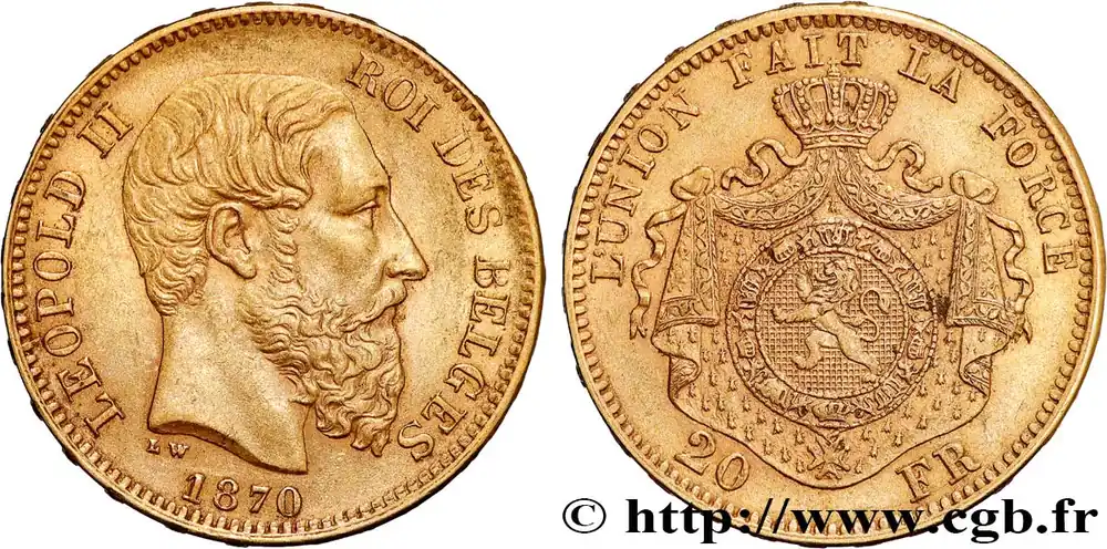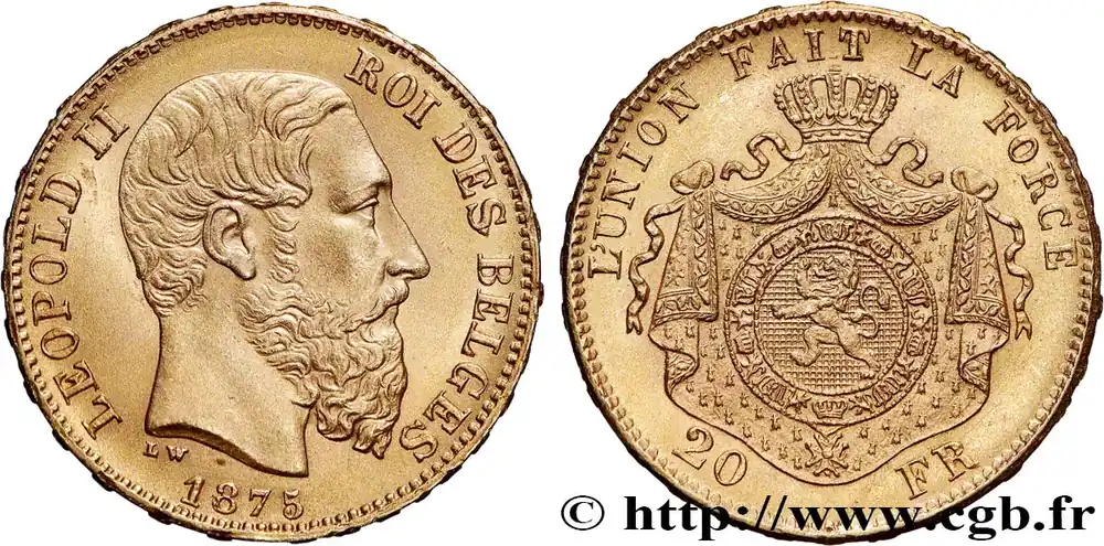 Type : 20 Francs Léopold IIDate : 1874Nom de l’atelier/ville : BruxellesQuantité frappée : 3046000Métal : orTitre en millième : 900 ‰Diamètre : 21 mmAxe des coins : 6 h.Poids : 6,46 g.Tranche : inscrite en reliefRéférence ouvrage :KM.19/37 AversTitulature avers : LEOPOLD II – ROI DES BELGES/ 1874.Description avers : Tête nue de Léopold II à droite ; dessous L W.ReversTitulature revers : L’UNION FAIT LA FORCE.Description revers : Écu entouré du collier de l’Ordre de Léopold posé sur un manteau couronné ; 20 – FR.CommentaireCe type est fabriqué suite à l’arrêté royal du 15 mars 1867. 28.641.770 pièces furent frappées entre 1866 (sic !) et 1882 et démonétisées en 1928. Il existe quatre types différents pour les pièces de 20 francs or. En 1870, le premier, le troisième et quatrième type ont été utilisés.HistoriqueOR, PALLADIUM ET PLATINE INVESTISSEMENTSécurisez et diversifiez votre épargne avec les métaux précieux :Dans un contexte d’instabilité politique et économique croissante, diversifier son épargne peut être une démarche judicieuse. Les métaux précieux comme l’or, le palladium et le platine constituent des actifs tangibles souvent prisés en raison de leur caractère intemporel et de leur résilience face aux fluctuations des marchés.Pour répondre à des besoins variés, l’achat de pièces officielles en or, palladium ou platine est une option flexible et adaptée. Ces pièces, disponibles à l’unité ou en lot, permettent à chacun d’ajuster ses choix selon ses objectifs et son budget, sans engagement à long terme.Un processus simple et sécurisé :Nous proposons une livraison sécurisée et garantie. Les paiements peuvent être effectués par carte bancaire ou par virement, bien que certaines transactions puissent nécessiter un règlement exclusivement par virement bancaire. Une pièce d’identité valide (carte nationale d’identité ou passeport) sera demandée pour finaliser votre achat.Stockage en toute sécurité et confidentialité :Le département Investissement de CGB Numismatique Paris met à votre disposition des solutions de stockage offrant une sécurité renforcée et une confidentialité optimale pour vos achats en or, palladium et platine.Contactez-nous pour plus d’informations :Pour toute question ou pour passer commande, prenez contact avec notre responsable des achats/ventes de métaux précieux : par email à [email protected] ou par téléphone. Nous mettons à votre disposition des informations générales et des services pour vous accompagner dans vos projets d’investissement.CGB Numismatique Paris agit en tant que fournisseur de métaux précieux et ne fournit aucun conseil en investissement. La valeur des métaux précieux peut fluctuer, et les performances passées ne garantissent pas les résultats futurs. L’achat de métaux précieux doit être considéré comme une stratégie de préservation de valeur plutôt qu’un investissement spéculatif. Conformément à l’article L.221-28 du Code de la consommation, le droit de rétractation ne s’applique pas aux achats d’or d’investissement, dont le prix dépend des fluctuations des marchés financiers.