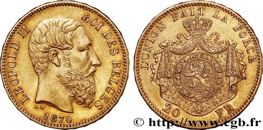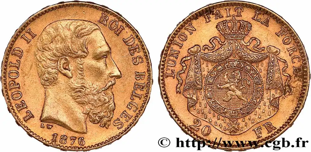 Type : 20 Francs Léopold IIDate : 1876Nom de l’atelier/ville : BruxellesQuantité frappée : 2009682Métal : orTitre en millième : 900 ‰Diamètre : 21 mmAxe des coins : 6 h.Poids : 6,43 g.Tranche : inscrite en relief ***** DIEU* PROTEGE* LA* BELGIQUERéférence ouvrage :DMP1556 – Morin141 – F.8 AversTitulature avers : LEOPOLD II – ROI DES BELGES/ 1876.Description avers : Tête nue de Léopold II à droite ; au-dessous L W.ReversTitulature revers : L’UNION FAIT LA FORCE.Description revers : Écu entouré du collier de l’Ordre de Léopold posé sur un manteau couronné ; 20 – FR.CommentaireCe type est fabriqué suite à l’arrêté royal du 15 mars 1867. 28.641.770 pièces furent frappées entre 1866 (sic !) et 1882 et démonétisées en 1928. Il existe quatre types différents pour les pièces de 20 francs or. En 1870, le premier, le troisième et quatrième type ont été utilisés.HistoriqueOR, PALLADIUM ET PLATINE INVESTISSEMENTSécurisez et diversifiez votre épargne avec les métaux précieux :Dans un contexte d’instabilité politique et économique croissante, diversifier son épargne peut être une démarche judicieuse. Les métaux précieux comme l’or, le palladium et le platine constituent des actifs tangibles souvent prisés en raison de leur caractère intemporel et de leur résilience face aux fluctuations des marchés.Pour répondre à des besoins variés, l’achat de pièces officielles en or, palladium ou platine est une option flexible et adaptée. Ces pièces, disponibles à l’unité ou en lot, permettent à chacun d’ajuster ses choix selon ses objectifs et son budget, sans engagement à long terme.Un processus simple et sécurisé :Nous proposons une livraison sécurisée et garantie. Les paiements peuvent être effectués par carte bancaire ou par virement, bien que certaines transactions puissent nécessiter un règlement exclusivement par virement bancaire. Une pièce d’identité valide (carte nationale d’identité ou passeport) sera demandée pour finaliser votre achat.Stockage en toute sécurité et confidentialité :Le département Investissement de CGB Numismatique Paris met à votre disposition des solutions de stockage offrant une sécurité renforcée et une confidentialité optimale pour vos achats en or, palladium et platine.Contactez-nous pour plus d’informations :Pour toute question ou pour passer commande, prenez contact avec notre responsable des achats/ventes de métaux précieux : par email à [email protected] ou par téléphone. Nous mettons à votre disposition des informations générales et des services pour vous accompagner dans vos projets d’investissement.CGB Numismatique Paris agit en tant que fournisseur de métaux précieux et ne fournit aucun conseil en investissement. La valeur des métaux précieux peut fluctuer, et les performances passées ne garantissent pas les résultats futurs. L’achat de métaux précieux doit être considéré comme une stratégie de préservation de valeur plutôt qu’un investissement spéculatif. Conformément à l’article L.221-28 du Code de la consommation, le droit de rétractation ne s’applique pas aux achats d’or d’investissement, dont le prix dépend des fluctuations des marchés financiers.