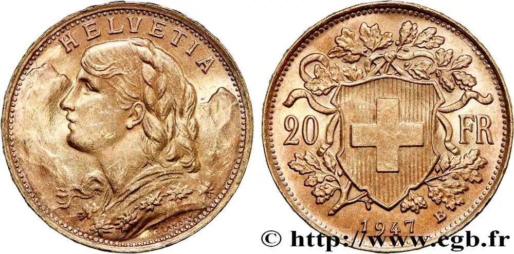 Type : 20 Francs or « Vreneli »Date : 1947Nom de l’atelier/ville : BerneQuantité frappée : 9200000Métal : orTitre en millième : 900 ‰Diamètre : 21 mmAxe des coins : 6 h.Poids : 6,45 g.Tranche : étoilée en reliefRéférence ouvrage :KM20/35.2  – HMZ.2-1186  – F.499  – OC.7.28 AversTitulature avers : HELVETIA.Description avers : Buste de jeune fille à gauche devant un paysage montagneux ; au-dessous signature F. LANDRY.ReversTitulature revers : 20 – FR/ 1947 B.Description revers : Écu posé sur une branche de chêne.CommentaireCe type est frappé suite à la loi du 6 janvier 1896. La pièce est fabriquée entre 1896 et 1926 dans le cadre de l’Union Latine, puis jusqu’à 1935. Enfin des pièces furent encore frappées en 1947 et 1949 à titre boursier.HistoriqueOR, PALLADIUM ET PLATINE INVESTISSEMENTSécurisez et diversifiez votre épargne avec les métaux précieux :Dans un contexte d’instabilité politique et économique croissante, diversifier son épargne peut être une démarche judicieuse. Les métaux précieux comme l’or, le palladium et le platine constituent des actifs tangibles souvent prisés en raison de leur caractère intemporel et de leur résilience face aux fluctuations des marchés.Pour répondre à des besoins variés, l’achat de pièces officielles en or, palladium ou platine est une option flexible et adaptée. Ces pièces, disponibles à l’unité ou en lot, permettent à chacun d’ajuster ses choix selon ses objectifs et son budget, sans engagement à long terme.Un processus simple et sécurisé :Nous proposons une livraison sécurisée et garantie. Les paiements peuvent être effectués par carte bancaire ou par virement, bien que certaines transactions puissent nécessiter un règlement exclusivement par virement bancaire. Une pièce d’identité valide (carte nationale d’identité ou passeport) sera demandée pour finaliser votre achat.Stockage en toute sécurité et confidentialité :Le département Investissement de CGB Numismatique Paris met à votre disposition des solutions de stockage offrant une sécurité renforcée et une confidentialité optimale pour vos achats en or, palladium et platine.Contactez-nous pour plus d’informations :Pour toute question ou pour passer commande, prenez contact avec notre responsable des achats/ventes de métaux précieux : par email à [email protected] ou par téléphone. Nous mettons à votre disposition des informations générales et des services pour vous accompagner dans vos projets d’investissement.CGB Numismatique Paris agit en tant que fournisseur de métaux précieux et ne fournit aucun conseil en investissement. La valeur des métaux précieux peut fluctuer, et les performances passées ne garantissent pas les résultats futurs. L’achat de métaux précieux doit être considéré comme une stratégie de préservation de valeur plutôt qu’un investissement spéculatif. Conformément à l’article L.221-28 du Code de la consommation, le droit de rétractation ne s’applique pas aux achats d’or d’investissement, dont le prix dépend des fluctuations des marchés financiers.