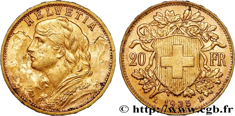 Type : 20 Francs « Vreneli » Date : 1935Nom de l’atelier/ville : BerneQuantité frappée : 20008813Métal : orTitre en millième : 900 ‰Diamètre : 21 mmAxe des coins : 6 h.Poids : 6,46 g.Tranche : étoilée en reliefRéférence ouvrage :KM20/35.1  – HMZ.2-1186  – F.499  – OC.7.27a AversTitulature avers : HELVETIA.Description avers : Buste de jeune fille à gauche devant un paysage montagneux ; au-dessous signature F. LANDRY.ReversTitulature revers : 20 – FR/ L 1935 B.Description revers : Écu posé sur une branche de chêne.HistoriqueOR, PALLADIUM ET PLATINE INVESTISSEMENTSécurisez et diversifiez votre épargne avec les métaux précieux :Dans un contexte d’instabilité politique et économique croissante, diversifier son épargne peut être une démarche judicieuse. Les métaux précieux comme l’or, le palladium et le platine constituent des actifs tangibles souvent prisés en raison de leur caractère intemporel et de leur résilience face aux fluctuations des marchés.Pour répondre à des besoins variés, l’achat de pièces officielles en or, palladium ou platine est une option flexible et adaptée. Ces pièces, disponibles à l’unité ou en lot, permettent à chacun d’ajuster ses choix selon ses objectifs et son budget, sans engagement à long terme.Un processus simple et sécurisé :Nous proposons une livraison sécurisée et garantie. Les paiements peuvent être effectués par carte bancaire ou par virement, bien que certaines transactions puissent nécessiter un règlement exclusivement par virement bancaire. Une pièce d’identité valide (carte nationale d’identité ou passeport) sera demandée pour finaliser votre achat.Stockage en toute sécurité et confidentialité :Le département Investissement de CGB Numismatique Paris met à votre disposition des solutions de stockage offrant une sécurité renforcée et une confidentialité optimale pour vos achats en or, palladium et platine.Contactez-nous pour plus d’informations :Pour toute question ou pour passer commande, prenez contact avec notre responsable des achats/ventes de métaux précieux : par email à [email protected] ou par téléphone. Nous mettons à votre disposition des informations générales et des services pour vous accompagner dans vos projets d’investissement.CGB Numismatique Paris agit en tant que fournisseur de métaux précieux et ne fournit aucun conseil en investissement. La valeur des métaux précieux peut fluctuer, et les performances passées ne garantissent pas les résultats futurs. L’achat de métaux précieux doit être considéré comme une stratégie de préservation de valeur plutôt qu’un investissement spéculatif. Conformément à l’article L.221-28 du Code de la consommation, le droit de rétractation ne s’applique pas aux achats d’or d’investissement, dont le prix dépend des fluctuations des marchés financiers.