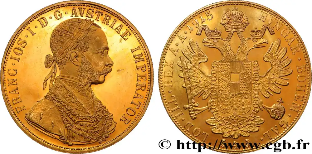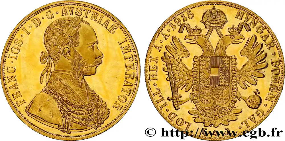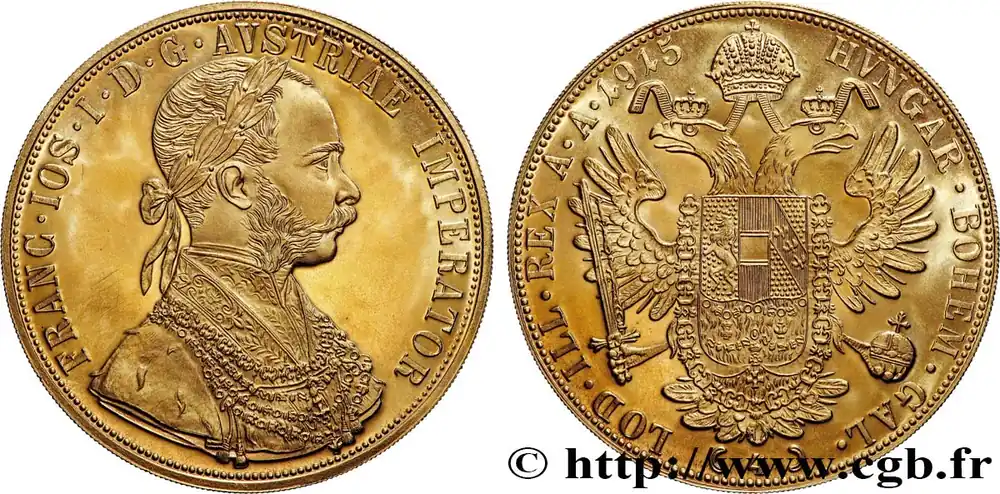 Type : 4 Ducats, refrappe moderne François Joseph Date : 1915Métal : orTitre en millième : 986 ‰Diamètre : 40 mmAxe des coins : 12 h.Poids : 14,00 g.Commentaires sur l’état de conservation :Traces de manipulationRéférence ouvrage :KM20/2276 AversTitulature avers : FRANC. IOS. I. D. G. AVSTRIAE IMPERATOR.Description avers : Buste habillé à droite de François Ier, la tête laurée.Traduction avers : (François Ier par la grâce de Dieu empereur d’Autriche).ReversTitulature revers : HVNGAR. BOHEM. GAL./ ( 4 )/ LOD. ILL. REX A. A. 1915.Description revers : Aigle bicéphale couronnée, les ailes déployées, tenant dans ses serres une épée et un monde ; en cœur, un écu entouré du collier de la Toison d’or.CommentaireLes monnaies autrichiennes datées 1915 sont des refrappes modernes.HistoriqueOR, PALLADIUM ET PLATINE INVESTISSEMENTSécurisez et diversifiez votre épargne avec les métaux précieux :Dans un contexte d’instabilité politique et économique croissante, diversifier son épargne peut être une démarche judicieuse. Les métaux précieux comme l’or, le palladium et le platine constituent des actifs tangibles souvent prisés en raison de leur caractère intemporel et de leur résilience face aux fluctuations des marchés.Pour répondre à des besoins variés, l’achat de pièces officielles en or, palladium ou platine est une option flexible et adaptée. Ces pièces, disponibles à l’unité ou en lot, permettent à chacun d’ajuster ses choix selon ses objectifs et son budget, sans engagement à long terme.Un processus simple et sécurisé :Nous proposons une livraison sécurisée et garantie. Les paiements peuvent être effectués par carte bancaire ou par virement, bien que certaines transactions puissent nécessiter un règlement exclusivement par virement bancaire. Une pièce d’identité valide (carte nationale d’identité ou passeport) sera demandée pour finaliser votre achat.Stockage en toute sécurité et confidentialité :Le département Investissement de CGB Numismatique Paris met à votre disposition des solutions de stockage offrant une sécurité renforcée et une confidentialité optimale pour vos achats en or, palladium et platine.Contactez-nous pour plus d’informations :Pour toute question ou pour passer commande, prenez contact avec notre responsable des achats/ventes de métaux précieux : par email à [email protected] ou par téléphone. Nous mettons à votre disposition des informations générales et des services pour vous accompagner dans vos projets d’investissement.CGB Numismatique Paris agit en tant que fournisseur de métaux précieux et ne fournit aucun conseil en investissement. La valeur des métaux précieux peut fluctuer, et les performances passées ne garantissent pas les résultats futurs. L’achat de métaux précieux doit être considéré comme une stratégie de préservation de valeur plutôt qu’un investissement spéculatif. Conformément à l’article L.221-28 du Code de la consommation, le droit de rétractation ne s’applique pas aux achats d’or d’investissement, dont le prix dépend des fluctuations des marchés financiers.