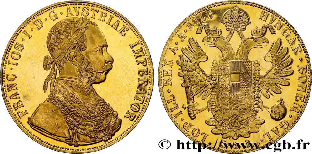 Type : 4 Ducats, refrappe moderne François Joseph Date : 1915Métal : orTitre en millième : 986 ‰Diamètre : 40 mmAxe des coins : 12 h.Poids : 14,00 g.Référence ouvrage :KM20/2276 AversTitulature avers : FRANC. IOS. I. D. G. AVSTRIAE IMPERATOR.Description avers : Buste habillé à droite de François Ier, la tête laurée.Traduction avers : (François Ier par la grâce de Dieu empereur d’Autriche).ReversTitulature revers : HVNGAR. BOHEM. GAL./ ( 4 )/ LOD. ILL. REX A. A. 1915.Description revers : Aigle bicéphale couronnée, les ailes déployées, tenant dans ses serres une épée et un monde ; en cœur, un écu entouré du collier de la Toison d’or.CommentaireLes monnaies autrichiennes datées 1915 sont des refrappes modernes.HistoriqueOR, PALLADIUM ET PLATINE INVESTISSEMENTSécurisez et diversifiez votre épargne avec les métaux précieux :Dans un contexte d’instabilité politique et économique croissante, diversifier son épargne peut être une démarche judicieuse. Les métaux précieux comme l’or, le palladium et le platine constituent des actifs tangibles souvent prisés en raison de leur caractère intemporel et de leur résilience face aux fluctuations des marchés.Pour répondre à des besoins variés, l’achat de pièces officielles en or, palladium ou platine est une option flexible et adaptée. Ces pièces, disponibles à l’unité ou en lot, permettent à chacun d’ajuster ses choix selon ses objectifs et son budget, sans engagement à long terme.Un processus simple et sécurisé :Nous proposons une livraison sécurisée et garantie. Les paiements peuvent être effectués par carte bancaire ou par virement, bien que certaines transactions puissent nécessiter un règlement exclusivement par virement bancaire. Une pièce d’identité valide (carte nationale d’identité ou passeport) sera demandée pour finaliser votre achat.Stockage en toute sécurité et confidentialité :Le département Investissement de CGB Numismatique Paris met à votre disposition des solutions de stockage offrant une sécurité renforcée et une confidentialité optimale pour vos achats en or, palladium et platine.Contactez-nous pour plus d’informations :Pour toute question ou pour passer commande, prenez contact avec notre responsable des achats/ventes de métaux précieux : par email à [email protected] ou par téléphone. Nous mettons à votre disposition des informations générales et des services pour vous accompagner dans vos projets d’investissement.CGB Numismatique Paris agit en tant que fournisseur de métaux précieux et ne fournit aucun conseil en investissement. La valeur des métaux précieux peut fluctuer, et les performances passées ne garantissent pas les résultats futurs. L’achat de métaux précieux doit être considéré comme une stratégie de préservation de valeur plutôt qu’un investissement spéculatif. Conformément à l’article L.221-28 du Code de la consommation, le droit de rétractation ne s’applique pas aux achats d’or d’investissement, dont le prix dépend des fluctuations des marchés financiers.