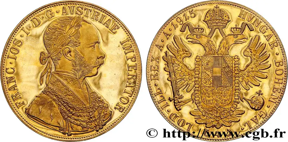 Type : 4 Ducats, refrappe moderne François Joseph Date : 1915Métal : orTitre en millième : 986 ‰Diamètre : 40 mmAxe des coins : 12 h.Poids : 13,97 g.Référence ouvrage :KM20/2276 AversTitulature avers : FRANC. IOS. I. D. G. AVSTRIAE IMPERATOR.Description avers : Buste habillé à droite de François Ier, la tête laurée.Traduction avers : (François Ier par la grâce de Dieu empereur d’Autriche).ReversTitulature revers : HVNGAR. BOHEM. GAL./ ( 4 )/ LOD. ILL. REX A. A. 1915.Description revers : Aigle bicéphale couronnée, les ailes déployées, tenant dans ses serres une épée et un monde ; en cœur, un écu entouré du collier de la Toison d’or.CommentaireLes monnaies autrichiennes datées 1915 sont des refrappes modernes.HistoriqueOR, PALLADIUM ET PLATINE INVESTISSEMENTSécurisez et diversifiez votre épargne avec les métaux précieux :Dans un contexte d’instabilité politique et économique croissante, diversifier son épargne peut être une démarche judicieuse. Les métaux précieux comme l’or, le palladium et le platine constituent des actifs tangibles souvent prisés en raison de leur caractère intemporel et de leur résilience face aux fluctuations des marchés.Pour répondre à des besoins variés, l’achat de pièces officielles en or, palladium ou platine est une option flexible et adaptée. Ces pièces, disponibles à l’unité ou en lot, permettent à chacun d’ajuster ses choix selon ses objectifs et son budget, sans engagement à long terme.Un processus simple et sécurisé :Nous proposons une livraison sécurisée et garantie. Les paiements peuvent être effectués par carte bancaire ou par virement, bien que certaines transactions puissent nécessiter un règlement exclusivement par virement bancaire. Une pièce d’identité valide (carte nationale d’identité ou passeport) sera demandée pour finaliser votre achat.Stockage en toute sécurité et confidentialité :Le département Investissement de CGB Numismatique Paris met à votre disposition des solutions de stockage offrant une sécurité renforcée et une confidentialité optimale pour vos achats en or, palladium et platine.Contactez-nous pour plus d’informations :Pour toute question ou pour passer commande, prenez contact avec notre responsable des achats/ventes de métaux précieux : par email à [email protected] ou par téléphone. Nous mettons à votre disposition des informations générales et des services pour vous accompagner dans vos projets d’investissement.CGB Numismatique Paris agit en tant que fournisseur de métaux précieux et ne fournit aucun conseil en investissement. La valeur des métaux précieux peut fluctuer, et les performances passées ne garantissent pas les résultats futurs. L’achat de métaux précieux doit être considéré comme une stratégie de préservation de valeur plutôt qu’un investissement spéculatif. Conformément à l’article L.221-28 du Code de la consommation, le droit de rétractation ne s’applique pas aux achats d’or d’investissement, dont le prix dépend des fluctuations des marchés financiers.