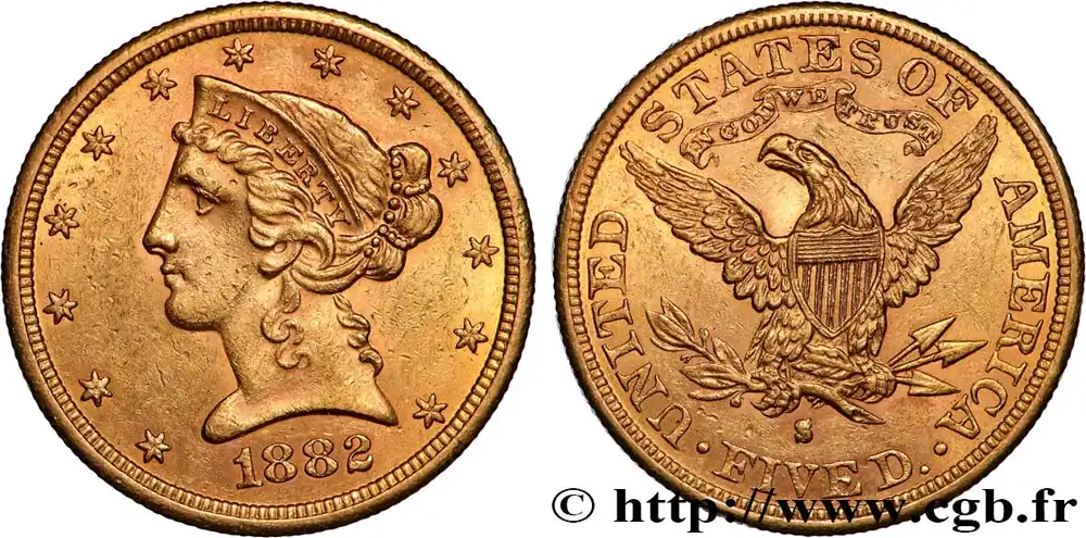 Type : 5 Dollars « Liberty »Date : 1886Nom de l’atelier/ville : San FranciscoQuantité frappée : 3268000Métal : orTitre en millième : 900 ‰Diamètre : 21,5 mmAxe des coins : 6 h.Poids : 8,37 g.Tranche : canneléeCommentaires sur l’état de conservation :Monnaie ayant été nettoyéeRéférence ouvrage :KM.19/101 – Y.- AversTitulature avers : 1886.Description avers : Tête de la Liberté à gauche entourée de treize étoiles avec un bandeau inscrit LIBERTY ; au-dessous le millésime.ReversTitulature revers : UNITED. STATES. OF. AMERICA/ FIVE D./ – IN/ GOD/ WE/ TRUST.Description revers : Aigle debout à gauche sur un faisceau.Traduction revers : (États-Unis d’Amérique ; 5 dollars ; en Dieu, nous faisons confiance).HistoriqueOR, PALLADIUM ET PLATINE INVESTISSEMENTSécurisez et diversifiez votre épargne avec les métaux précieux :Dans un contexte d’instabilité politique et économique croissante, diversifier son épargne peut être une démarche judicieuse. Les métaux précieux comme l’or, le palladium et le platine constituent des actifs tangibles souvent prisés en raison de leur caractère intemporel et de leur résilience face aux fluctuations des marchés.Pour répondre à des besoins variés, l’achat de pièces officielles en or, palladium ou platine est une option flexible et adaptée. Ces pièces, disponibles à l’unité ou en lot, permettent à chacun d’ajuster ses choix selon ses objectifs et son budget, sans engagement à long terme.Un processus simple et sécurisé :Nous proposons une livraison sécurisée et garantie. Les paiements peuvent être effectués par carte bancaire ou par virement, bien que certaines transactions puissent nécessiter un règlement exclusivement par virement bancaire. Une pièce d’identité valide (carte nationale d’identité ou passeport) sera demandée pour finaliser votre achat.Stockage en toute sécurité et confidentialité :Le département Investissement de CGB Numismatique Paris met à votre disposition des solutions de stockage offrant une sécurité renforcée et une confidentialité optimale pour vos achats en or, palladium et platine.Contactez-nous pour plus d’informations :Pour toute question ou pour passer commande, prenez contact avec notre responsable des achats/ventes de métaux précieux : par email à [email protected] ou par téléphone. Nous mettons à votre disposition des informations générales et des services pour vous accompagner dans vos projets d’investissement.CGB Numismatique Paris agit en tant que fournisseur de métaux précieux et ne fournit aucun conseil en investissement. La valeur des métaux précieux peut fluctuer, et les performances passées ne garantissent pas les résultats futurs. L’achat de métaux précieux doit être considéré comme une stratégie de préservation de valeur plutôt qu’un investissement spéculatif. Conformément à l’article L.221-28 du Code de la consommation, le droit de rétractation ne s’applique pas aux achats d’or d’investissement, dont le prix dépend des fluctuations des marchés financiers.