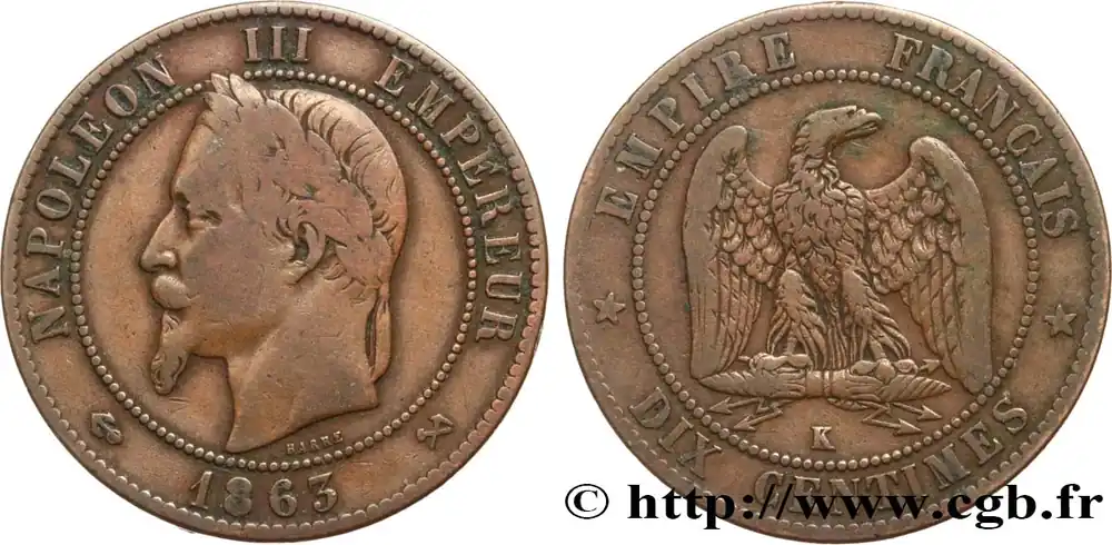 Type : Dix centimes Napoléon III, tête lauréeDate : 1864Nom de l’atelier/ville : ParisQuantité frappée : 1556490Métal : bronzeDiamètre : 30 mmAxe des coins : 6 h.Poids : 10,03 g.Tranche : lisseDegré de rareté : R1Commentaires sur l’état de conservation :Exemplaire nettoyémais agréableRéférence ouvrage :Classement FRANC 2023 / FRANC 2023 classificationF.134/13AversTitulature avers : NAPOLEON III EMPEREUR// (ANCRE) 1864 (MM).Description avers : Tête laurée de Napoléon III à gauche ; signé BARRE au-dessous.ReversTitulature revers : EMPIRE FRANÇAIS// * DIX CENTIMES *.Description revers : Aigle debout sur un foudre, les ailes ouvertes, la tête tournée à droite ; au-dessous A.HistoriqueSECOND EMPIRE(02/12/1852-04/09/1870) Proclamé empereur sous le nom de Napoléon III, Louis Napoléon fait son entrée solennelle à Paris le 2 décembre 1852. Il épouse Eugénie Marie de Montijo, aristocrate espagnole, en janvier 1853. Son règne peut se diviser en trois périodes : l’Empire autoritaire jusqu’en 1860 ; l’Empire libéral de 1860 à 1870 puis l’Empire parlementaire en 1870. Durant l’Empire autoritaire, Napoléon III exerce son pouvoir sans partage, contrôle la presse tandis que les journaux pratiquent l’autocensure pour éviter leur suppression. Les préfets exercent une puissance illimitée dans les départements, les maires, les fonctionnaires sont nommés par le gouvernement. Comme sous le Premier Empire, l’Éducation et l’Université sont surveillées. Maintenant les grands principes de la révolution, la souveraineté du peuple est continuée grâce à la consultation par plébiscite. Sur le plan économique, l’essor est important, l’industrialisation se développe ainsi que les organismes de crédit et les grands magasins. Le prestige militaire est accru par la guerre de Crimée qui permet à la France de jouer un rôle international. L’attentat d’Orsini (janvier 1858) n’empêche nullement la France d’intervenir en Italie pour faire triompher le principe des nationalités et permet le rattachement de Nice et de la Savoie par le traité de Turin (mars 1860). Dès 1860, l’Empire évolue vers plus de libertés : traité libre-échangiste de commerce avec l’Angleterre, apparition d’une faible opposition dans le Corps législatif, octroi du droit de grève (1864), libéralisation de la presse (1868). Sur le plan international, la France acquiert la Nouvelle-Calédonie, la Cochinchine et encourage le creusement du canal de Suez par Ferdinand de Lesseps. Au Mexique, le soutien à Maximilien et à l’Autriche est toutefois un échec. Les élections de 1869 sont très mauvaises pour le régime et l’opposition obtient 45 % des voix. Le régime évolue alors vers un Empire parlementaire en appelant Émile Ollivier, chef du parti orléaniste et libéral, au pouvoir. Après Sadowa en 1866 où la Prusse écrase l’Autriche, l’affaire du trône d’Espagne et de la dépêche d’Ems entraînent la guerre qui est déclarée le 19 juillet 1870. Accumulant les revers, l’armée française est encerclée dans Metz puis Napoléon III, malade, capitule à Sedan le 2 septembre. Aussitôt la nouvelle connue, la déchéance de l’Empire est annoncée par Gambetta puis la République est proclamée le 4 septembre. Napoléon III est alors emmené en captivité en Hesse puis part dans le Kent où il meurt en 1873.