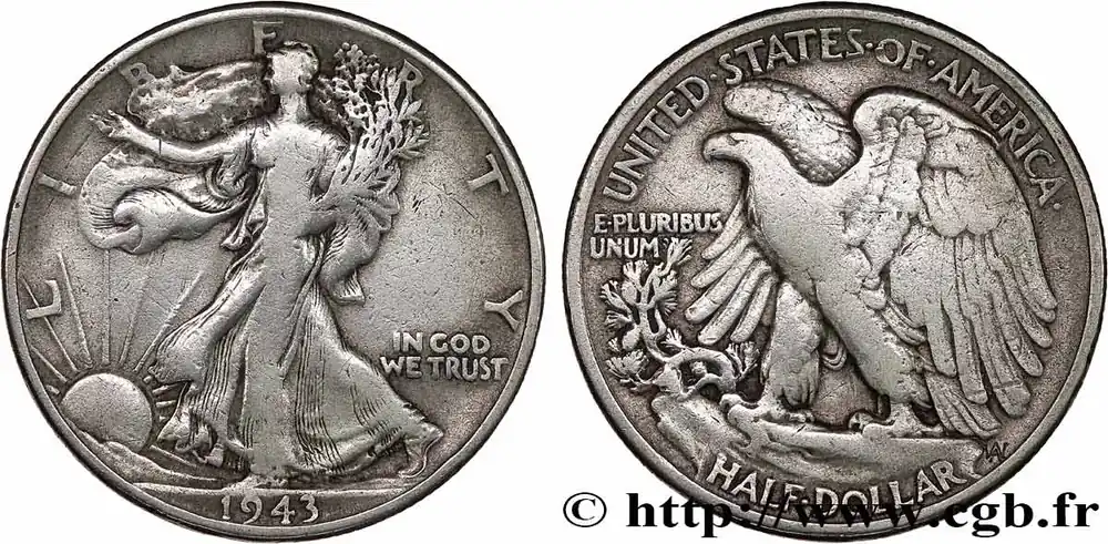 Type : 1/2 Dollar Walking LibertyDate : 1943Nom de l’atelier/ville : PhiladelphieQuantité frappée : 53190000Métal : argentTitre en millième : 900 ‰Diamètre : 30,6 mmAxe des coins : 6 h.Poids : 12,20 g.Tranche : canneléeCommentaires sur l’état de conservation :monnaie nettoyéeRéférence ouvrage :KM20/142 – Y.- AversTitulature avers : LIBERTY // (DATE).Description avers : Liberté marchant à gauche, soleil levant ; IN GOD / WE TRUST dans le champ.Traduction avers : (Liberté).ReversTitulature revers : UNITED STATES OF AMERICA // HALF DOLLAR.Description revers : aigle aux ailes déployées ; E.PLURIBUS / UNUM dans le champ à gauche.Traduction revers : (États-Unis d’Amérique // demi-dollar).HistoriqueÉTATS-UNIS D’AMÉRIQUE